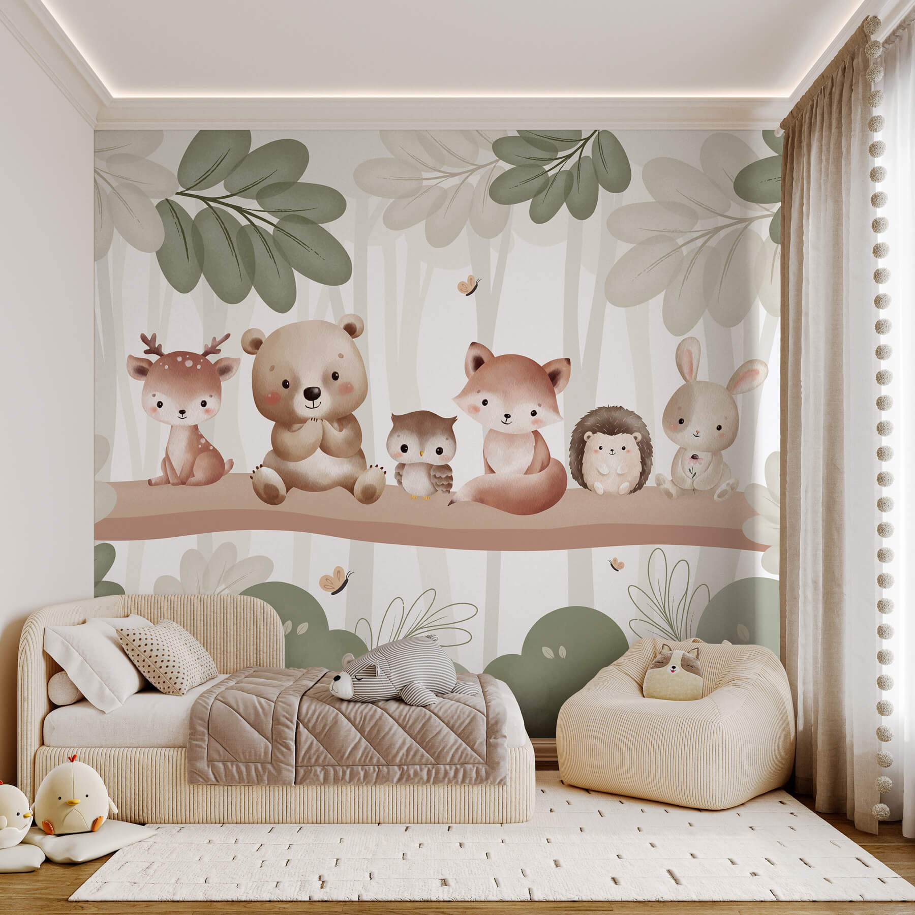 Stellen Sie sich eine gemütliche Ecke vor, die mit dem Charme einer Waldlandschaft gefüllt ist. Dieses entzückende Wandbild zeigt eine liebenswerte Gruppe von Tierfreunden, die auf einem Ast hocken und jedem Raum einen Hauch von Laune verleihen. Stellen Sie sich ein scheues Reh, einen neugierigen Bären und einen verspielten Fuchs vor, die alle inmitten von grünem Laub sitzen. Es ist die perfekte Kulisse für ein Kinderzimmer, die zu Geschichten über Abenteuer im Zauberwald anregt. Jeder Blick lädt zum Kichern und zur Fantasie ein und schafft eine Wärme, die sich wie eine Lieblingsdecke um einen legt. Verwandeln Sie das Gewöhnliche in etwas ganz Besonderes mit diesen niedlichen Waldfreunden!