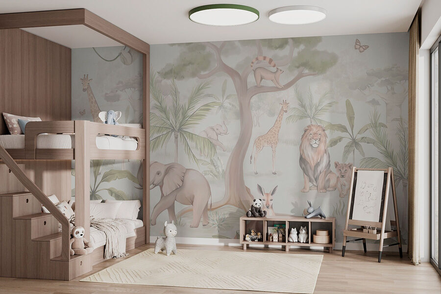 Verwandeln Sie jeden Raum in einen charmanten Zufluchtsort mit dieser entzückenden Fototapete, die eine sanfte Mischung aus Tieren und üppigem Grün zeigt. Stellen Sie sich einen Elefanten vor, der herumtollt, ein Faultier, das in einem Baum chillt, und Giraffen, die durch die Palmen spähen – es ist wie eine Mini-Safari direkt zu Hause! Dieses Wandbild strahlt Wärme und Launenhaftigkeit aus und eignet sich daher perfekt für Kinderzimmer oder eine gemütliche Leseecke. Stellen Sie sich vor, Sie schlürfen einen Tee, während Sie von der Natur umgeben sind, spüren eine frische Brise und hören vielleicht sogar einen entfernten Vogel singen. Jeder Blick bringt einen Hauch von Abenteuer und ein Lächeln! Perfekt für alle, die einzigartige Dekoration und einen Hauch von Wildnis in ihrem Leben lieben.