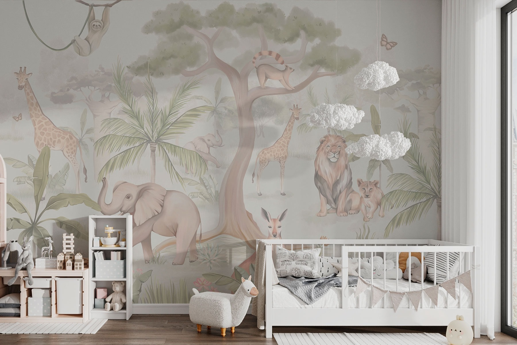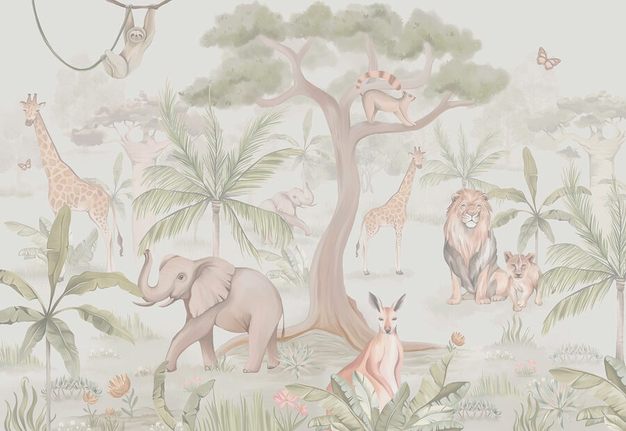 Verwandeln Sie jeden Raum in einen charmanten Zufluchtsort mit dieser entzückenden Fototapete, die eine sanfte Mischung aus Tieren und üppigem Grün zeigt. Stellen Sie sich einen Elefanten vor, der herumtollt, ein Faultier, das in einem Baum chillt, und Giraffen, die durch die Palmen spähen – es ist wie eine Mini-Safari direkt zu Hause! Dieses Wandbild strahlt Wärme und Launenhaftigkeit aus und eignet sich daher perfekt für Kinderzimmer oder eine gemütliche Leseecke. Stellen Sie sich vor, Sie schlürfen einen Tee, während Sie von der Natur umgeben sind, spüren eine frische Brise und hören vielleicht sogar einen entfernten Vogel singen. Jeder Blick bringt einen Hauch von Abenteuer und ein Lächeln! Perfekt für alle, die einzigartige Dekoration und einen Hauch von Wildnis in ihrem Leben lieben.