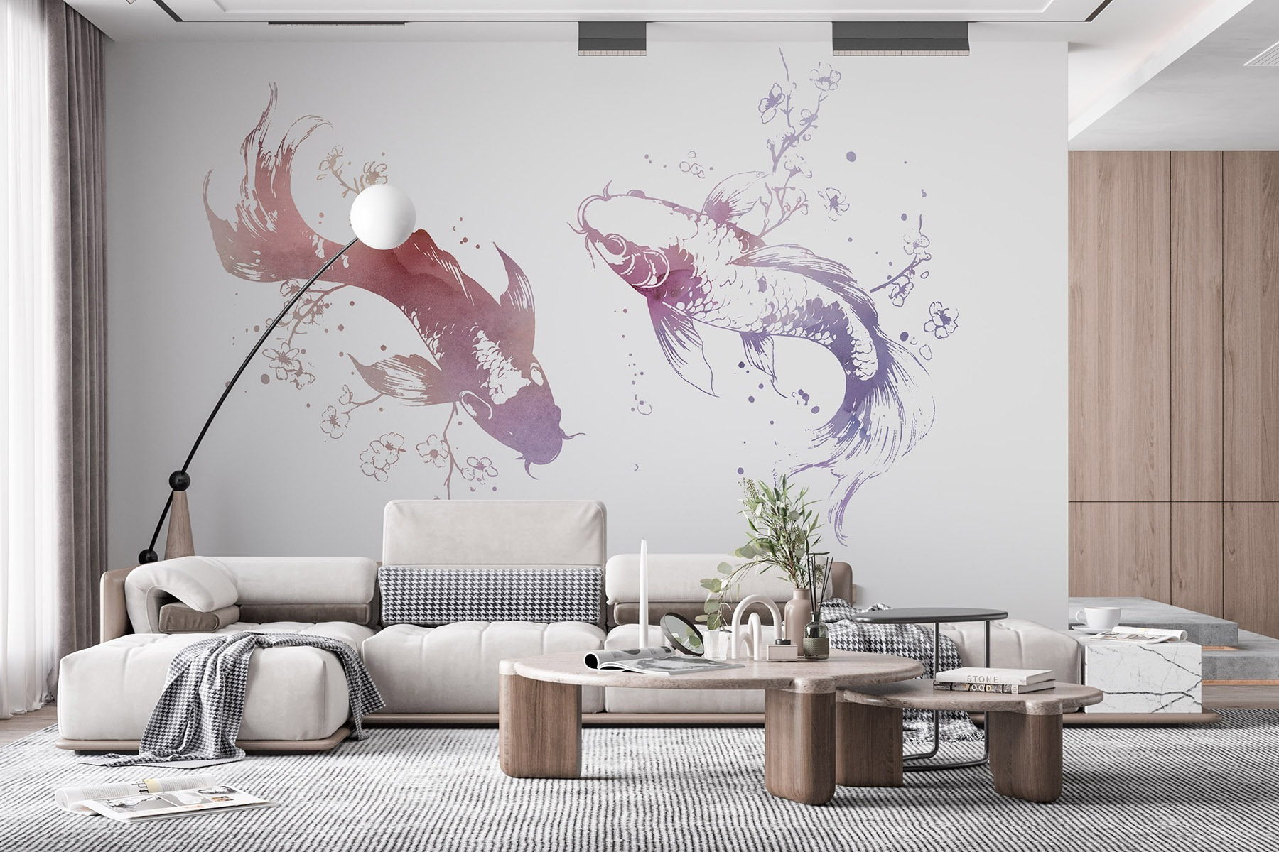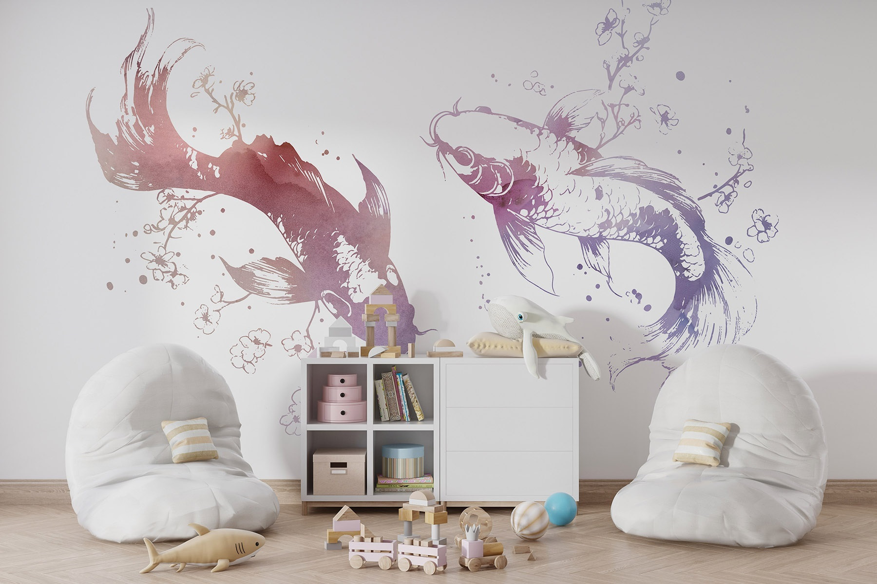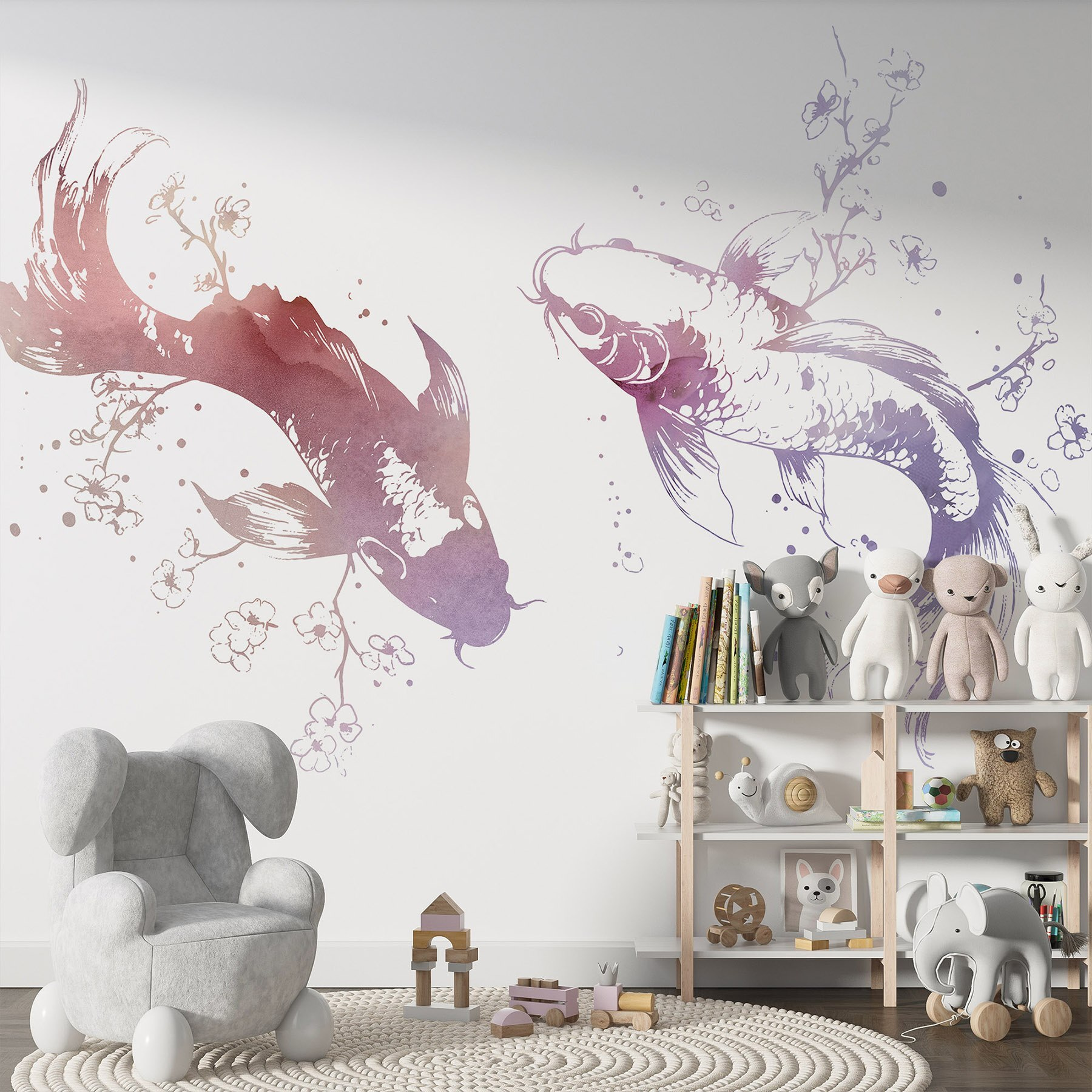 Verwandeln Sie Ihren Raum in ein wässriges Wunderland mit dieser bezaubernden Fototapete, auf der zwei anmutige Fische durch zarte Blumen und wirbelnde Blätter schwimmen. Stellen Sie sich vor, Sie würden in eine heitere Unterwasserwelt eintauchen, in der Kunst an Ihren Wänden tanzt und Ruhe und Kreativität hervorruft. Der Aquarellstil dieses Wandbildes verleiht ihm einen skurrilen Touch und macht es perfekt für eine gemütliche Leseecke oder einen luftigen Wohnbereich mit Strandmotiven. Stellen Sie sich vor, Sie schlürfen einen Tee, während die Fische sanft an Ihnen vorbeigleiten und die Natur direkt in Ihr Zuhause bringen. Es ist wie Ihre eigene persönliche Oase, nur ohne nasse Füße und Seetang!