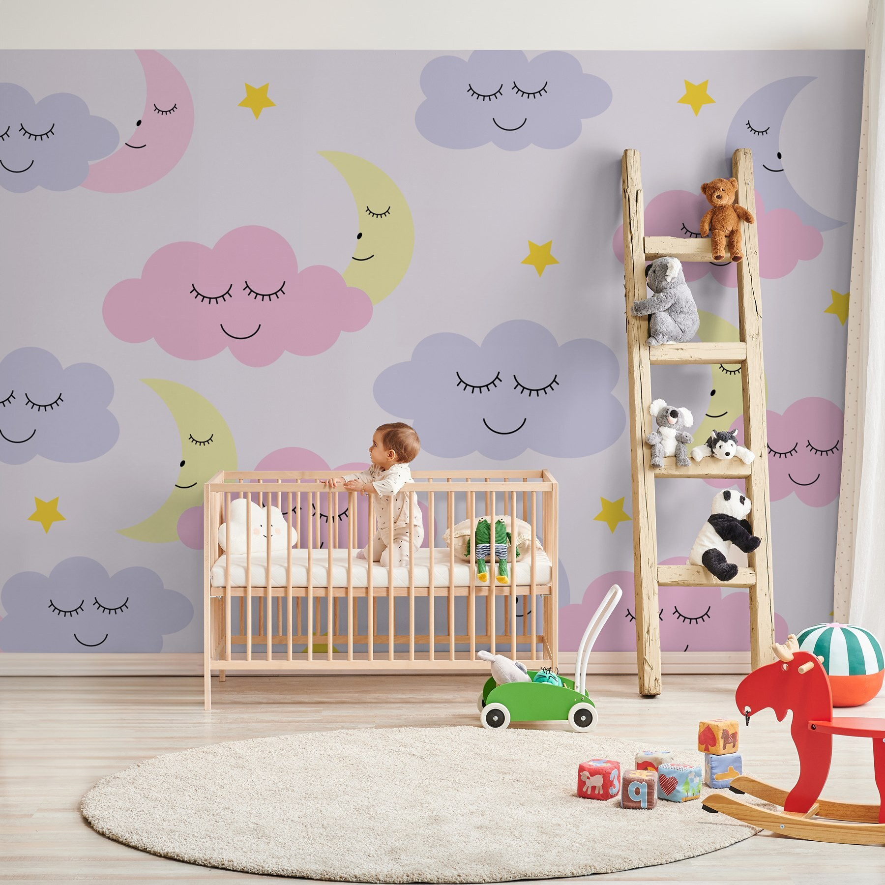 Verwandeln Sie den Raum Ihrer Kleinen in einen verträumten Zufluchtsort mit diesem bezaubernden Wandbild, das fröhliche Wolken, verspielte Sterne und schlafende Monde zeigt. Als hätte der Nachthimmel ein fröhliches Makeover bekommen! Stellen Sie sich das Lächeln während der Märchenstunde vor, wenn die Kinder unter den flauschigen rosa und lila Wolken liegen und süße Träume träumen. Jedes Element fühlt sich wie eine warme Umarmung an und lädt zu Fantasie und Staunen ein. Perfekt für ein Kinderzimmer oder ein Spielzimmer, ist es nicht nur Dekoration, sondern ein gemütlicher Rückzugsort, an dem Träume fliegen und Abenteuer beginnen. Wer würde nicht gerne in diese liebliche Szene abtauchen?