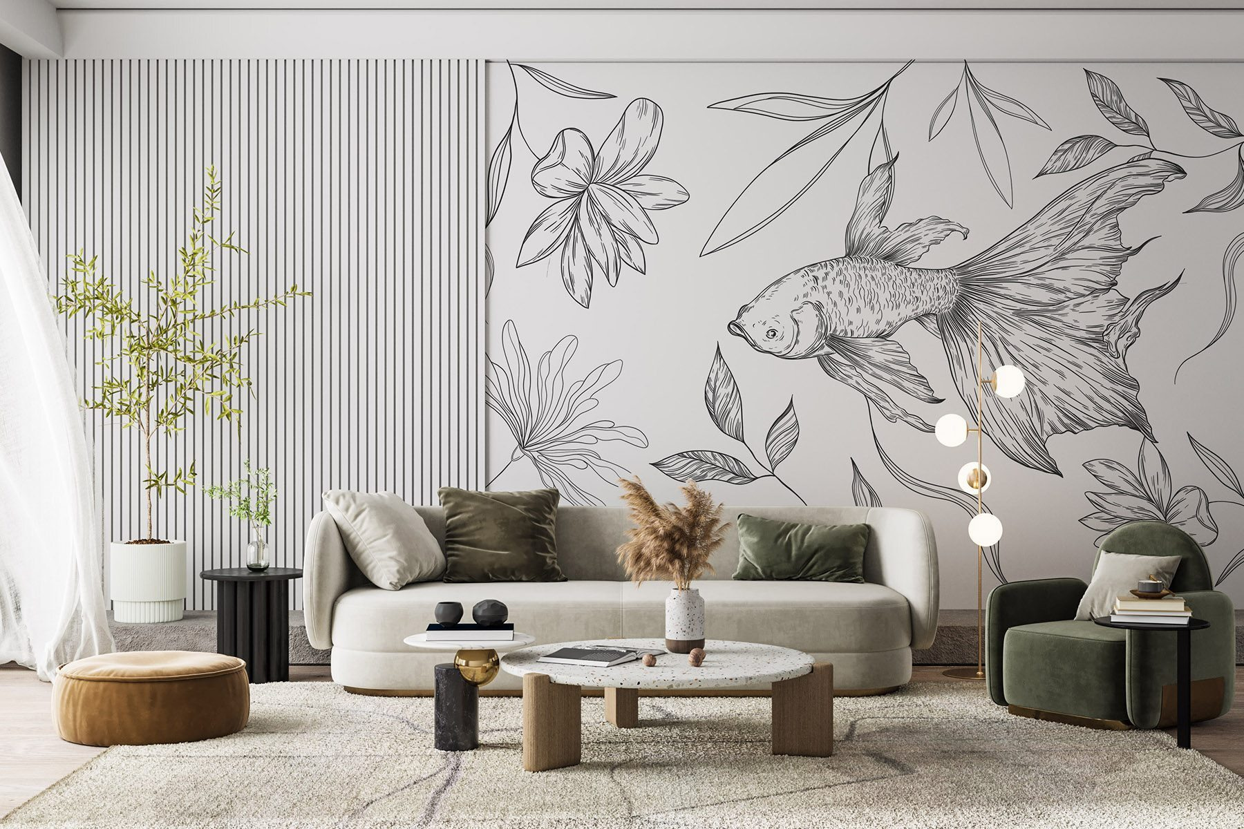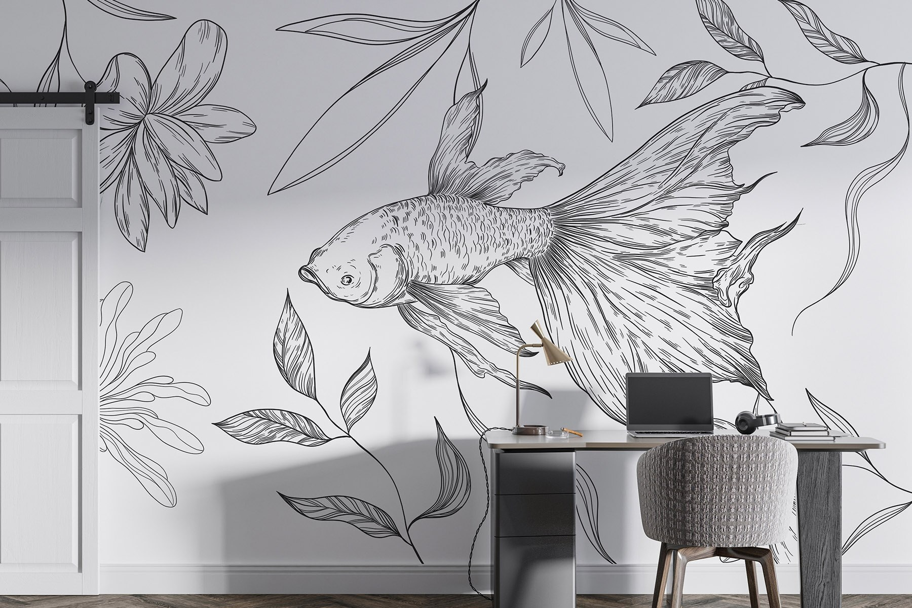 Mit dieser bezaubernden Fototapete, die einen charmanten Fisch zeigt, der zwischen zarten Pflanzen gleitet, können Sie jeden Raum verändern. Das schwarz-weiße Design sorgt für ein einzigartiges Flair und verleiht dem Raum einen Hauch von Eleganz, ohne ihn zu überwältigen. Stellen Sie sich vor, wie Sie an Ihrem Kaffee nippen und die sanften Linien an der Wand tanzen, um beruhigende Gedanken und kreative Ideen zu wecken. Es ist wie ein Flüstern der Natur, das Ruhe in Ihre Hektik bringt. Perfekt für alle, die ihre Wände mit künstlerischer Magie verzaubern wollen, ist es auch ein Gesprächsanlass. Wer würde nicht gerne über den “Schwimmkumpel” an seiner Wand plaudern?