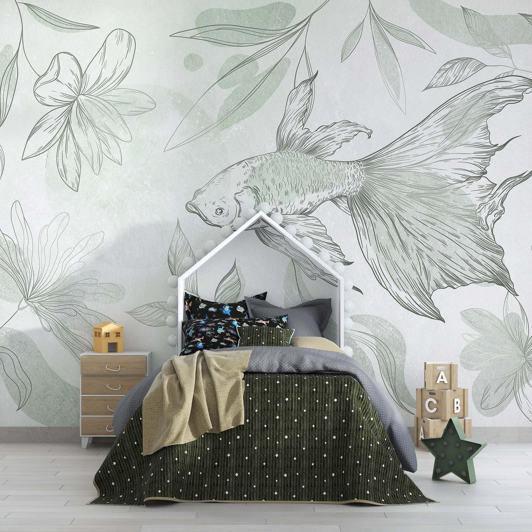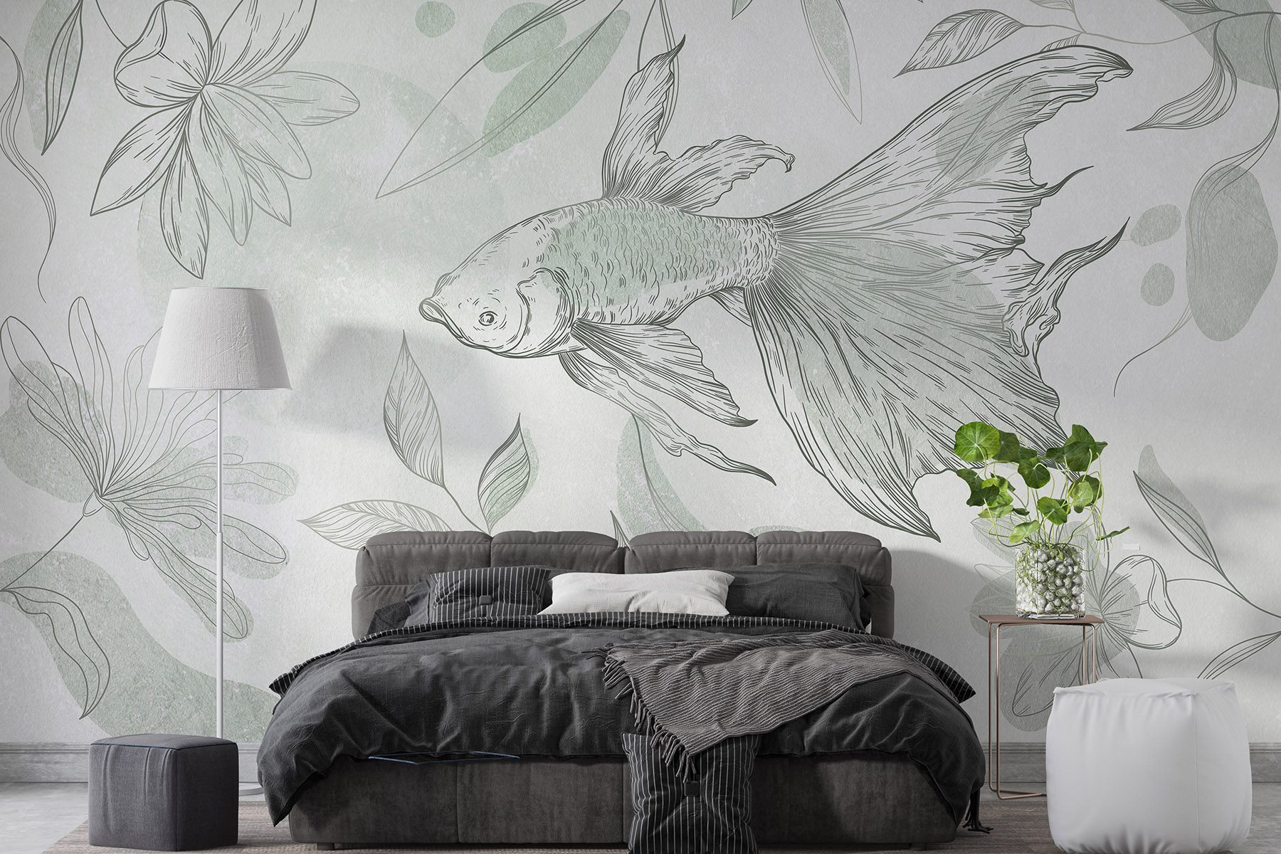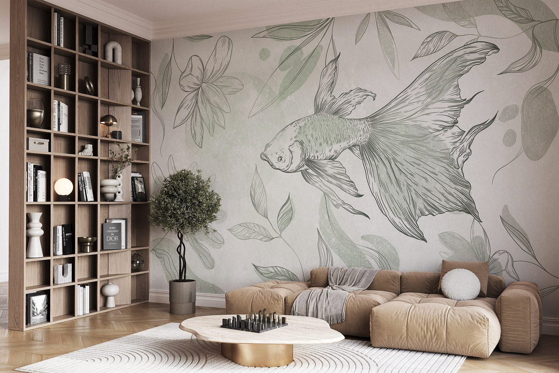 Dieses Wandbild mit zarten Fischen und skurrilen Pflanzen verwandelt jeden Raum in eine heitere Oase. Es ist, als würde man sich ein Stück Natur ins Haus holen, wo sanfte Farben an den Wänden tanzen und ein Gefühl der Ruhe vermitteln. Stellen Sie sich vor, Sie schlürfen einen Tee, während Sie diese anmutigen Fische betrachten, als würden sie durch Ihre Tagträume schwimmen. Es eignet sich perfekt für eine gemütliche Leseecke oder eine leere Wand, die schon lange nach etwas Leben verlangt. Diese Fototapete dekoriert nicht nur, sie verbreitet auch eine friedliche Stimmung und macht jeden Blick zu einem kleinen Ausflug. Im Ernst, wer hätte gedacht, dass sich Wohnkultur wie ein ruhiges Aquarium anfühlen kann?