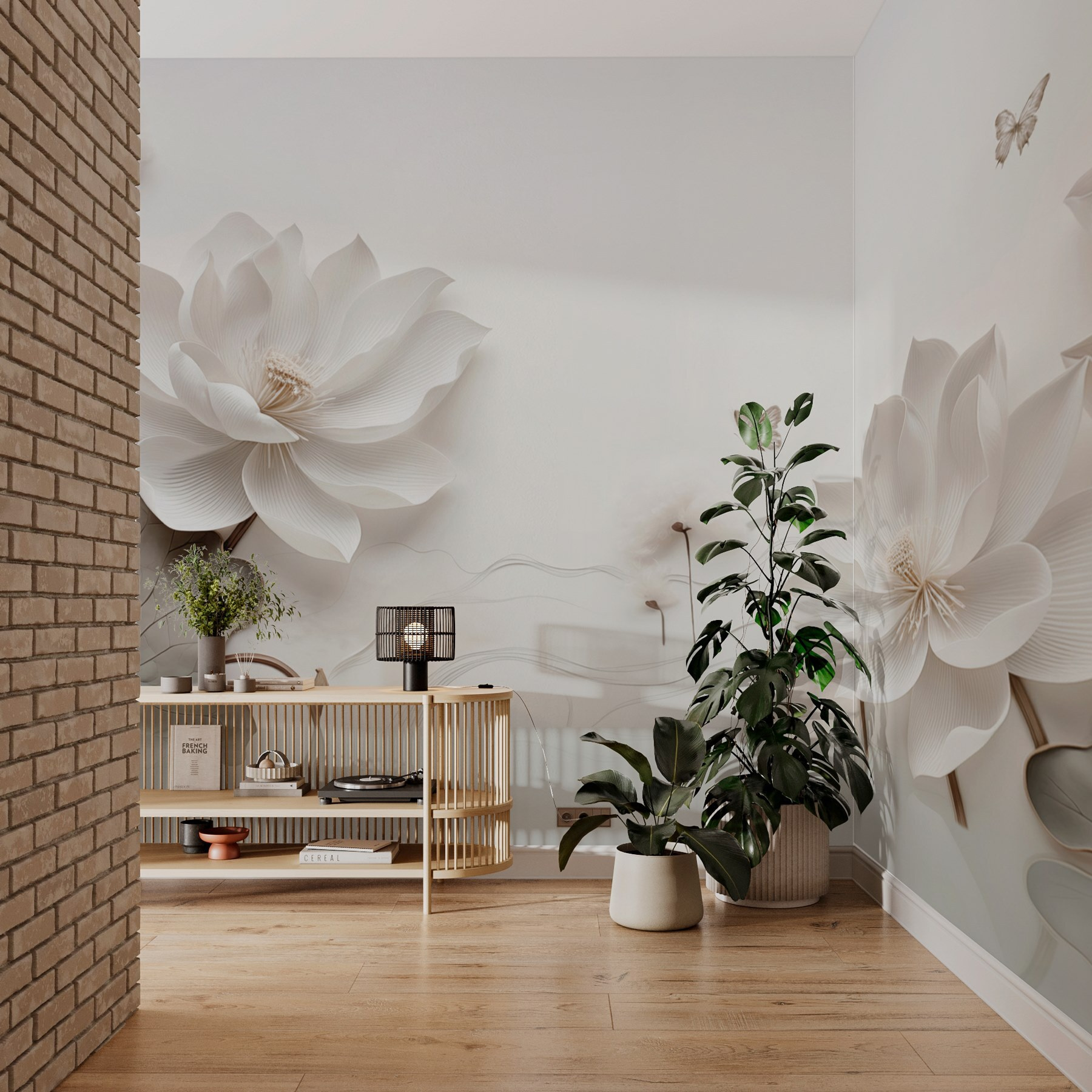Verwandeln Sie jeden Raum mit diesem verträumten Wandbild mit zarten weißen Papierblumen und flatternden Schmetterlingen. Stellen Sie sich vor, Sie betreten einen Raum und haben das Gefühl, dass Sie gerade in einen ruhigen Garten eingetreten sind – kein Gießen erforderlich! Das sanfte, minimalistische Design bringt einen Hauch von Natur ins Haus und lässt das ganze Jahr über Frühlingsgefühle aufkommen. Es ist die perfekte Kulisse für gemütliche Nachmittage oder geselliges Beisammensein. Stellen Sie sich vor, wie Freunde faulenzen oder Kinder spielen, während Sie von einer beruhigenden, eleganten Atmosphäre umgeben sind. Diese Fototapete ist nicht nur Dekoration, sondern ein Erlebnis, das darauf wartet, Ihre Wände zu verschönern.