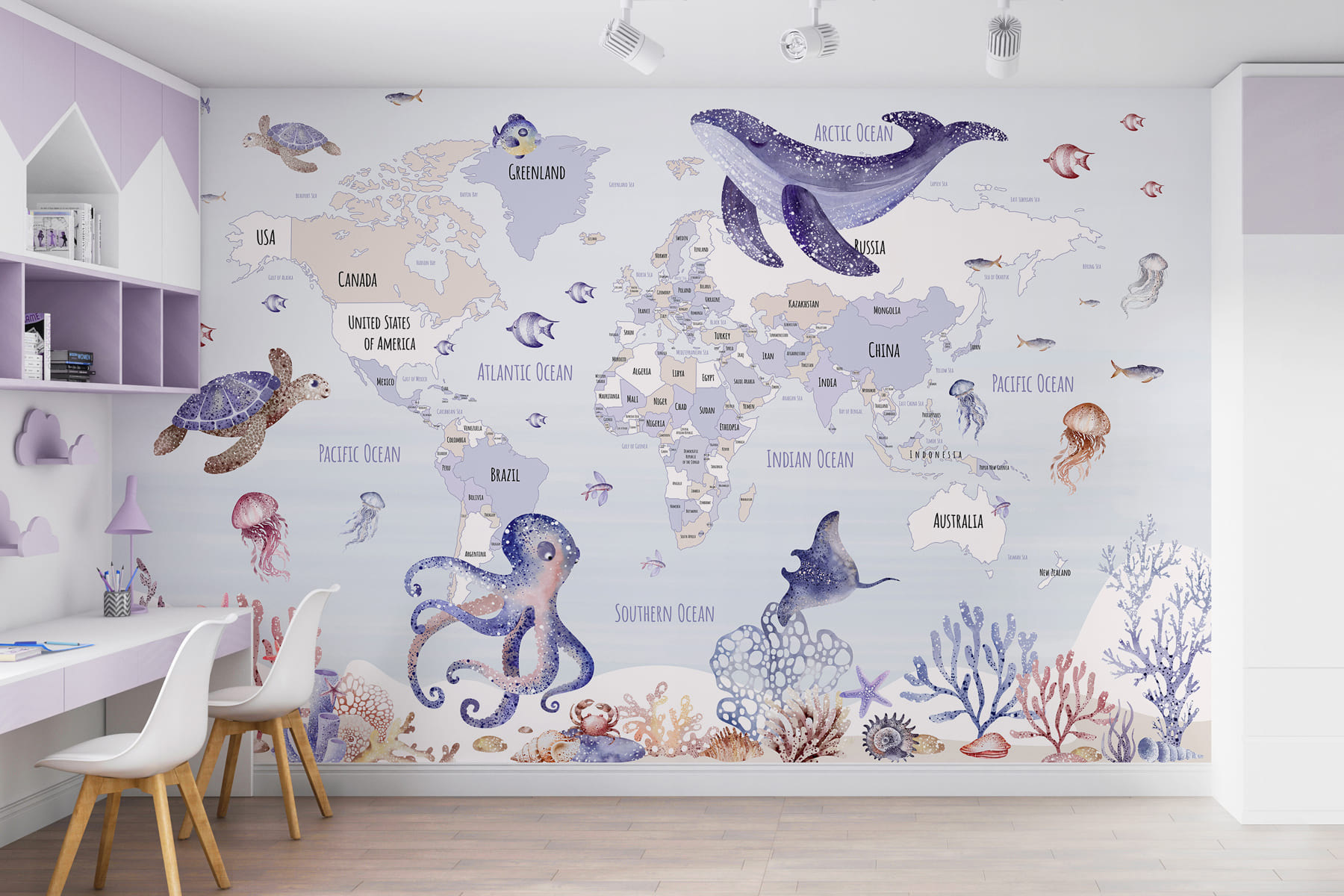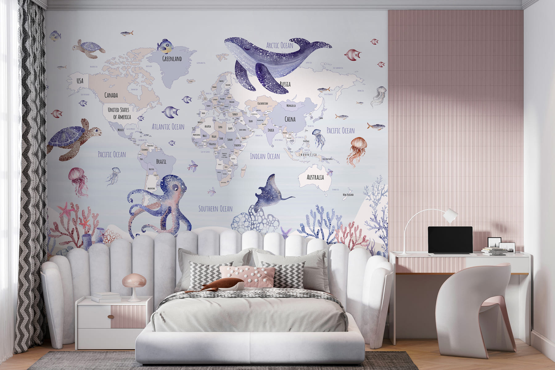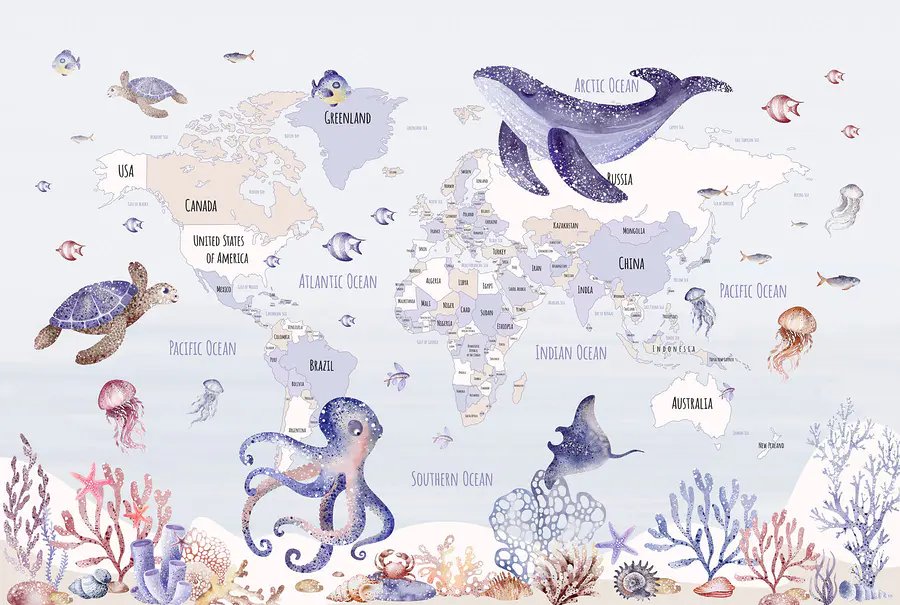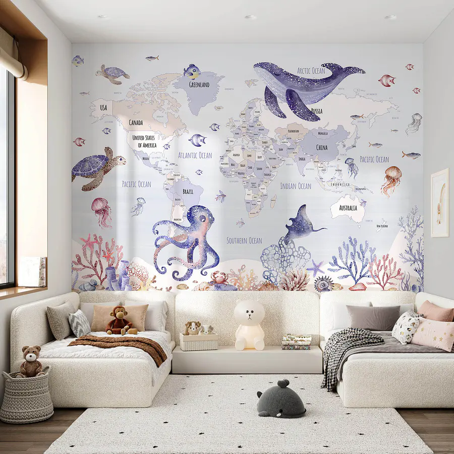 Verwandeln Sie jedes Zimmer in ein kleines Abenteuer mit dieser bezaubernden Fototapete, die eine charmante Weltkarte inmitten von Meeresbewohnern zeigt. Stellen Sie sich vor, wie sie Ihre kleinen Entdecker dazu einlädt, etwas über ferne Länder zu lernen, während sie von skurrilen Schildkröten, verspielten Tintenfischen und sanften Walen umgeben sind. Es ist nicht nur ein Wandbild, sondern eine eigene Geschichte zum Thema Meer, die darauf wartet, sich zu entfalten. Es eignet sich perfekt für Spielzimmer oder gemütliche Ecken, weckt die Neugierde, beflügelt die Fantasie und verwandelt vielleicht sogar einen langweiligen Dienstag in einen Tagtraum unter dem Meer. Wer weiß, vielleicht inspiriert es ja auch einen zukünftigen Meeresbiologen!
