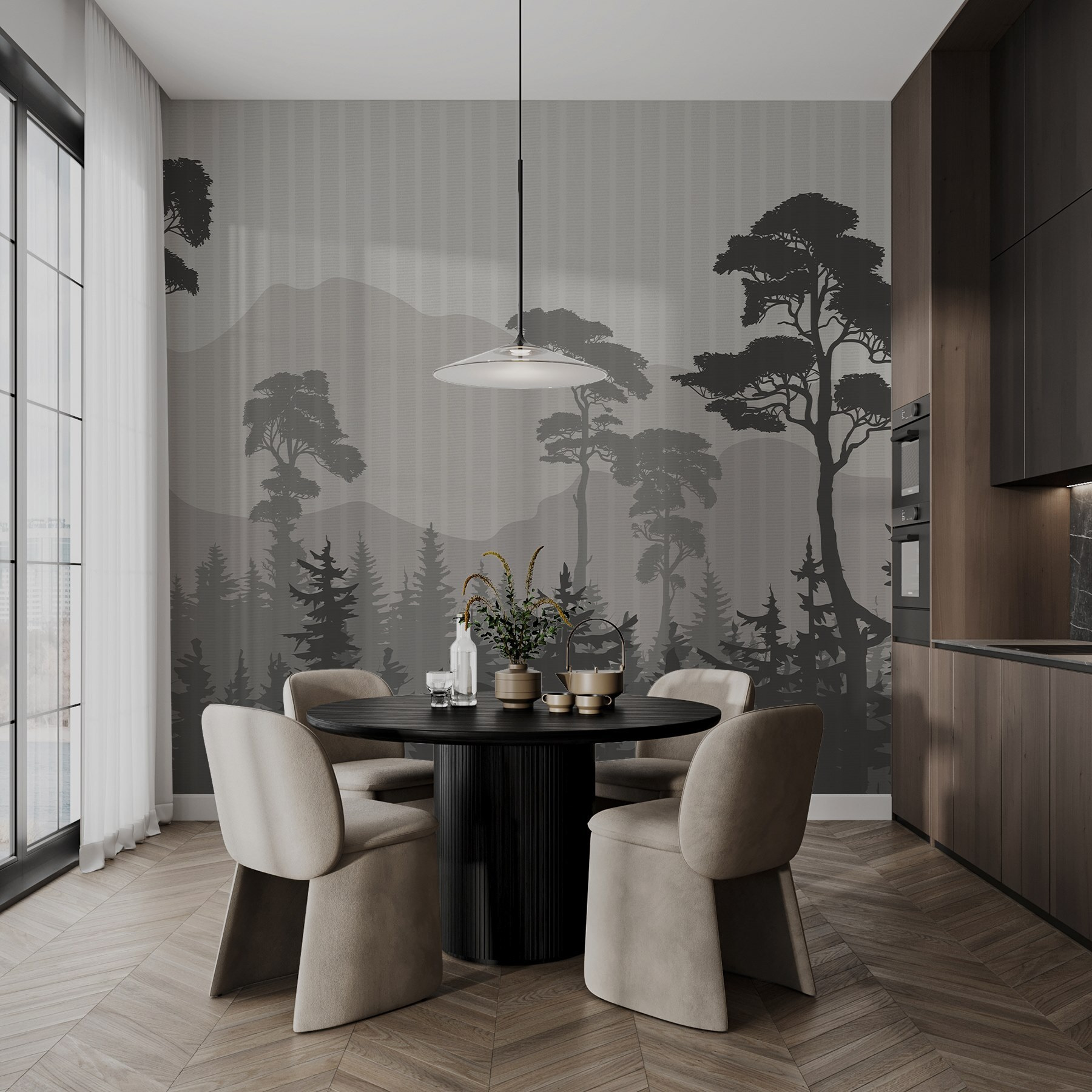 Verwandeln Sie Ihren Raum mit dieser atemberaubenden Fototapete, die eine atemberaubende Landschaft mit Bäumen und Bergen zeigt. Stellen Sie sich vor, Sie wachen jeden Tag mit der ruhigen Silhouette hoch aufragender Kiefern vor sanften Hügeln auf, die eine perfekte Kulisse für Entspannung bieten. Es ist, als hätten Sie die Natur direkt in Ihrem Wohnzimmer, nur ohne die Ungeziefer und das Wetter. Diese Fototapete sorgt für eine erdige Atmosphäre, die Ihren Raum erdet und gleichzeitig einen Hauch von Raffinesse verleiht. Stellen Sie sich einen gemütlichen Abend vor – sanftes Licht, vielleicht ein Buch in der Hand, und diese schöne Szene, die genau den richtigen Hauch von Ruhe verleiht. Machen Sie sich bereit, die Natur zu genießen, ganz bequem von zu Hause aus!