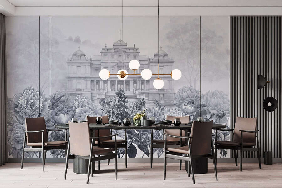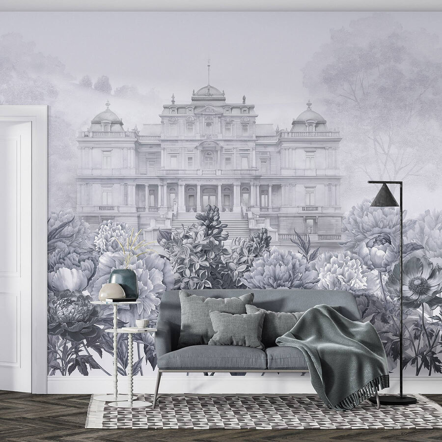 Treten Sie mit diesem atemberaubenden Wandbild in eine Welt ein, in der Eleganz auf Natur trifft. Stellen Sie sich ein prächtiges weißes Gebäude vor, das durch einen üppigen Garten mit Pfingstrosen hindurchschaut und zu Tagträumen von einem Nachmittagstee auf einer sonnenbeschienenen Terrasse einlädt. Die sanften Grautöne schaffen einen beruhigenden Hintergrund, der perfekt ist, um sich nach einem langen Tag zu entspannen. Freunde werden mitten im Gespräch innehalten, fasziniert von der einzigartigen Schönheit. Es ist, als ob Sie sich den Geschmack eines europäischen Landguts in Ihr Wohnzimmer holen, aber ohne das hohe Preisschild. Hängen Sie diese Schönheit an eine Wand und lassen Sie Ihren Raum erblühen!
