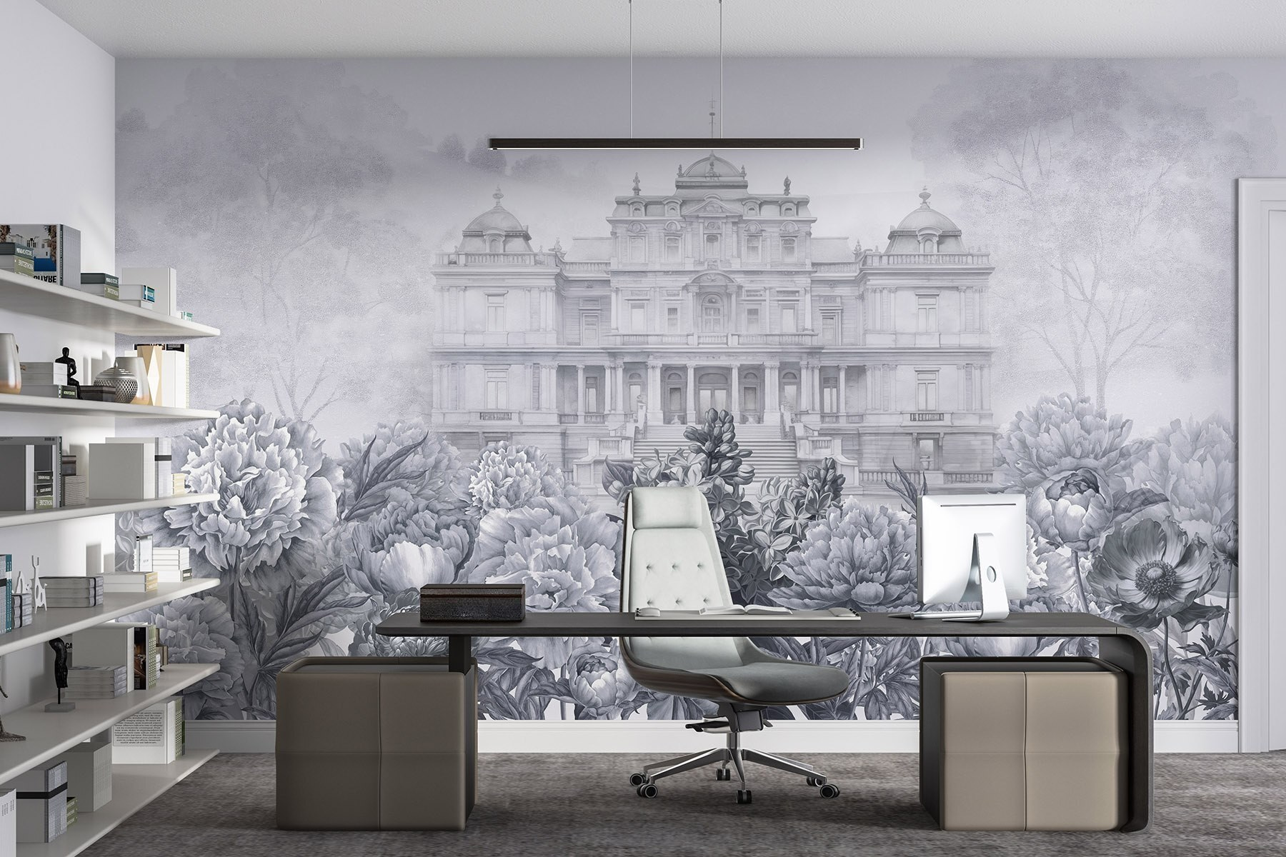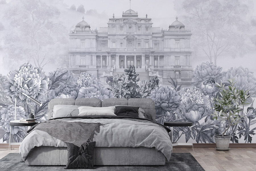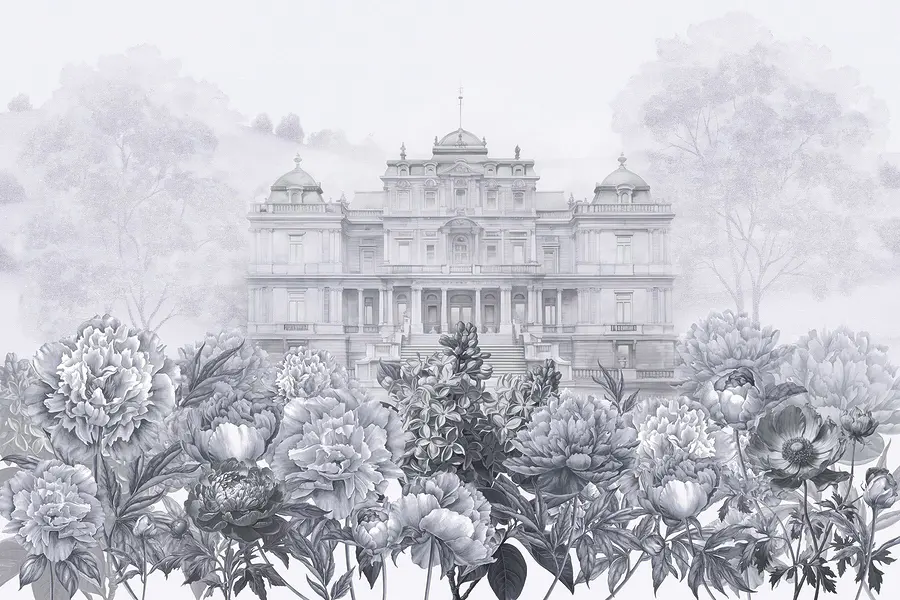 Treten Sie mit diesem atemberaubenden Wandbild in eine Welt ein, in der Eleganz auf Natur trifft. Stellen Sie sich ein prächtiges weißes Gebäude vor, das durch einen üppigen Garten mit Pfingstrosen hindurchschaut und zu Tagträumen von einem Nachmittagstee auf einer sonnenbeschienenen Terrasse einlädt. Die sanften Grautöne schaffen einen beruhigenden Hintergrund, der perfekt ist, um sich nach einem langen Tag zu entspannen. Freunde werden mitten im Gespräch innehalten, fasziniert von der einzigartigen Schönheit. Es ist, als ob Sie sich den Geschmack eines europäischen Landguts in Ihr Wohnzimmer holen, aber ohne das hohe Preisschild. Hängen Sie diese Schönheit an eine Wand und lassen Sie Ihren Raum erblühen!