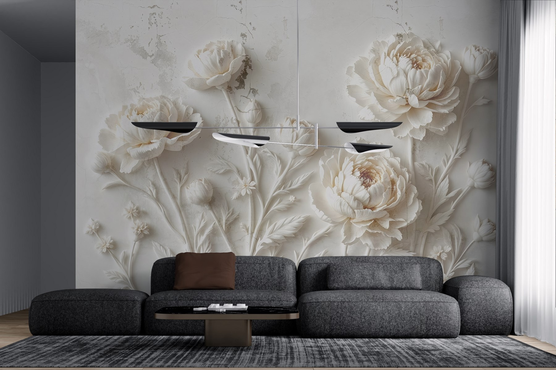 Mit dieser hübschen Fototapete mit weißem Blumendesign lässt sich ein Raum ganz einfach umgestalten. Stellen Sie sich vor, Sie wachen mit zarten Pfingstrosen auf, die vor Charme und Eleganz nur so strotzen. Es ist, als ob man sich einen Garten ins Haus holt, ohne die lästige Pflege. Das subtile Relief und die filigranen Details schaffen eine friedliche Atmosphäre, die perfekt ist, um nach einem langen Tag zu entspannen. Ihre Freunde werden denken, dass Sie einen Künstler engagiert haben, aber es wird Ihr kleines Geheimnis bleiben. Ob in einer gemütlichen Ecke oder in einem hellen Flur, dieses Wandbild strahlt Raffinesse aus – keine Notwendigkeit für eine Teeparty, aber es schafft die richtige Stimmung für eine solche!
