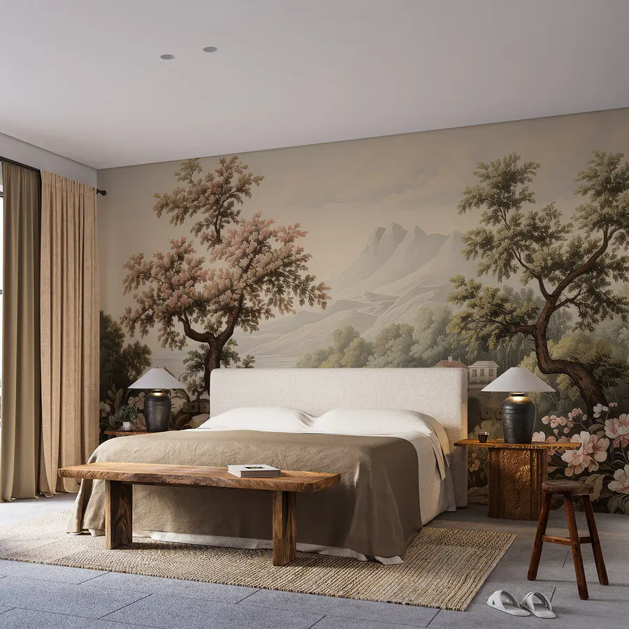 Dieses Wandbild mit einer Landschaft aus Bäumen und Blumen verwandelt einen Raum in einen ruhigen Rückzugsort und bringt die Natur direkt in Ihren Raum. Stellen Sie sich vor, Sie beginnen Ihren Tag mit dieser ruhigen Aussicht – das Sonnenlicht tanzt auf den Blütenblättern, und eine sanfte Brise scheint die Blätter zum Rascheln zu bringen. Es flüstert Entspannung und lädt zu Momenten der Ruhe ein, weit weg von der Hektik und dem Trubel. Dieses Wandbild eignet sich perfekt für eine gemütliche Leseecke oder das manchmal triste Büro, denn es verwandelt die Wände in Fenster und lässt ein Stückchen Natur in die Seele. Wer würde nicht lächeln bei dem Gedanken, jeden Tag in eine solch friedliche Szene einzutreten?