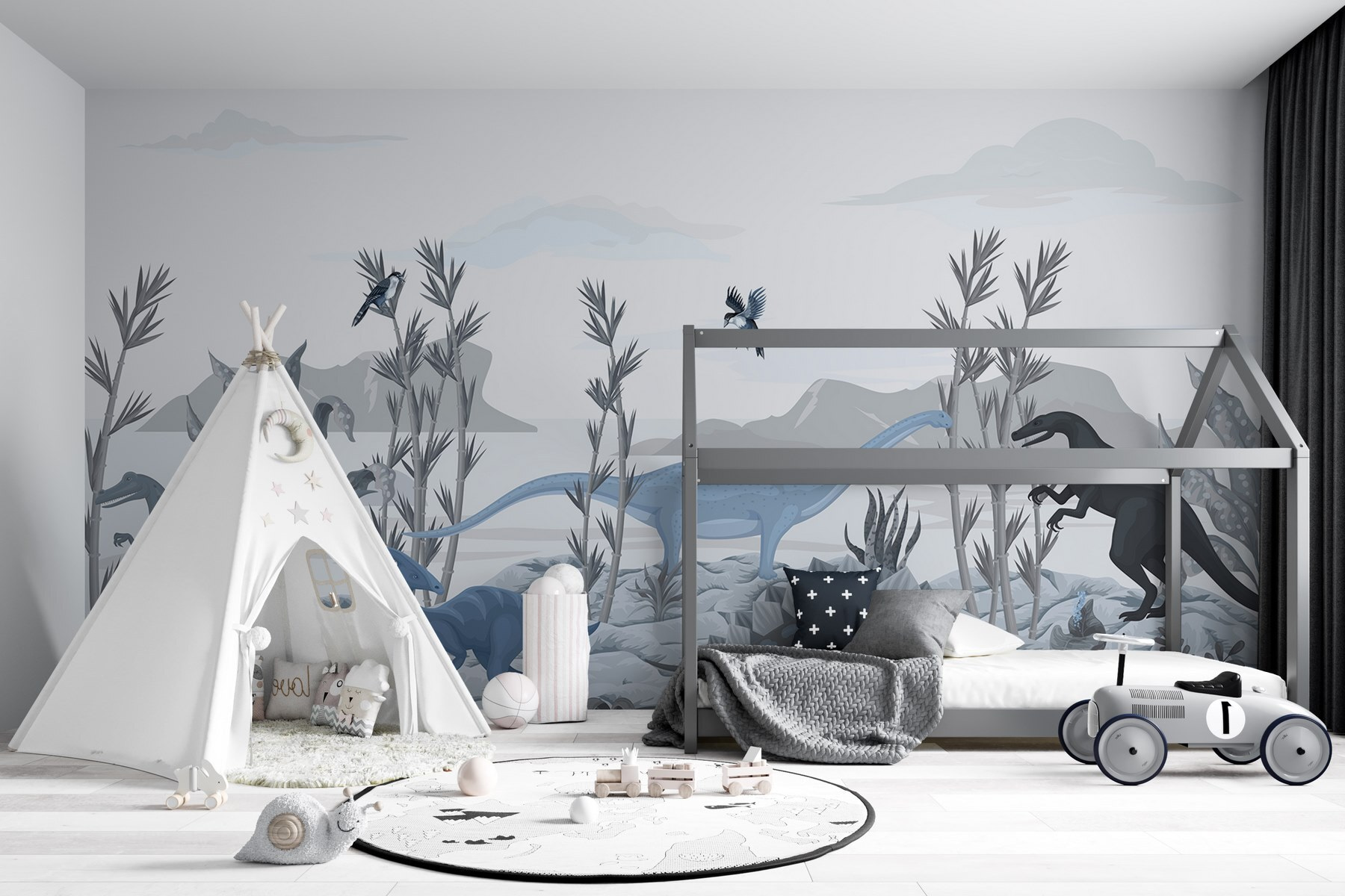 Verwandeln Sie den Raum eines Kindes in ein prähistorisches Abenteuer mit diesem fesselnden Dinosaurier-Wandbild. Stellen Sie sich vor, wie die Kleinen mit leuchtenden Augen eine Welt entdecken, in der Giganten umherstreifen und ihrer Fantasie zwischen sanften Brontosauriern und wilden T. Rexen freien Lauf lassen. Die beruhigenden Farben und komplizierten Details der Landschaft schaffen eine ruhige Atmosphäre, die perfekt zum Träumen oder für Geschichten ist. Hängen Sie es in einem Spielzimmer oder Schlafzimmer auf und beobachten Sie, wie es Neugier und Staunen weckt. Es ist nicht nur ein Wandbild, sondern eine Einladung, eine Welt zu erkunden, in der sich jeder Tag ein bisschen abenteuerlicher anfühlt. Vielleicht fangen die Kinder sogar an, von Dino-Abenteuern zu träumen!