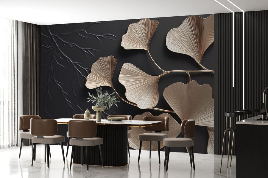 Verwandeln Sie Ihren Raum mit dieser beeindruckenden Fototapete, die kunstvolle Ginkgoblätter auf einem einzigartigen Hintergrund zeigt. Stellen Sie sich vor, Sie wachen mit den sanften, natürlichen Tönen des Laubes auf, das Ihre Wände umgibt. Es verleiht Ihnen einen Hauch von Natur, der Ihre Gäste zum Staunen bringen wird. Die anmutigen Blätter scheinen zu tanzen und schaffen eine beruhigende Atmosphäre, die sich perfekt für eine gemütliche Leseecke oder einen lebhaften Essbereich eignet. Außerdem lässt es sich leicht anbringen – perfekt für alle, die eine schnelle Verschönerung ohne Schmutz lieben. Diese Fototapete könnte Sie zu ein paar tiefen Atemzügen und Tagträumen inspirieren. Wer würde das nicht wollen?