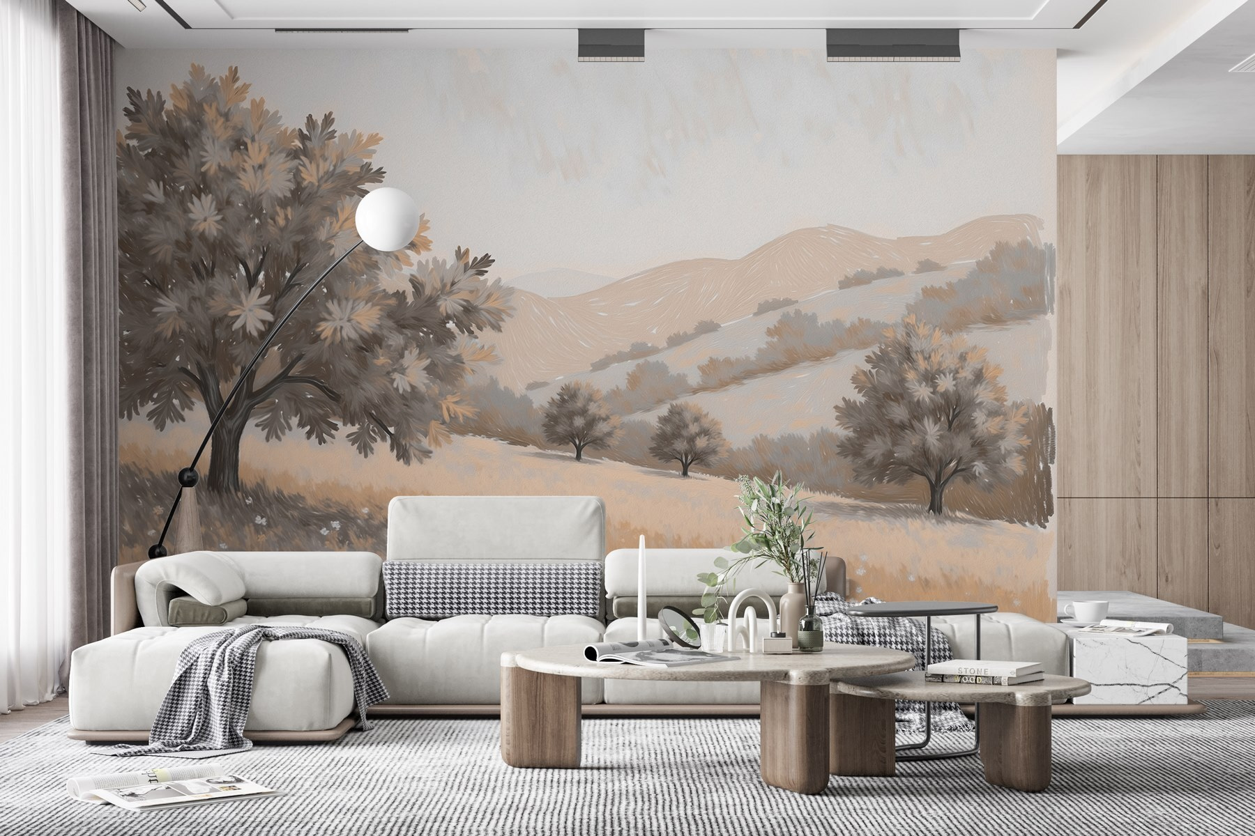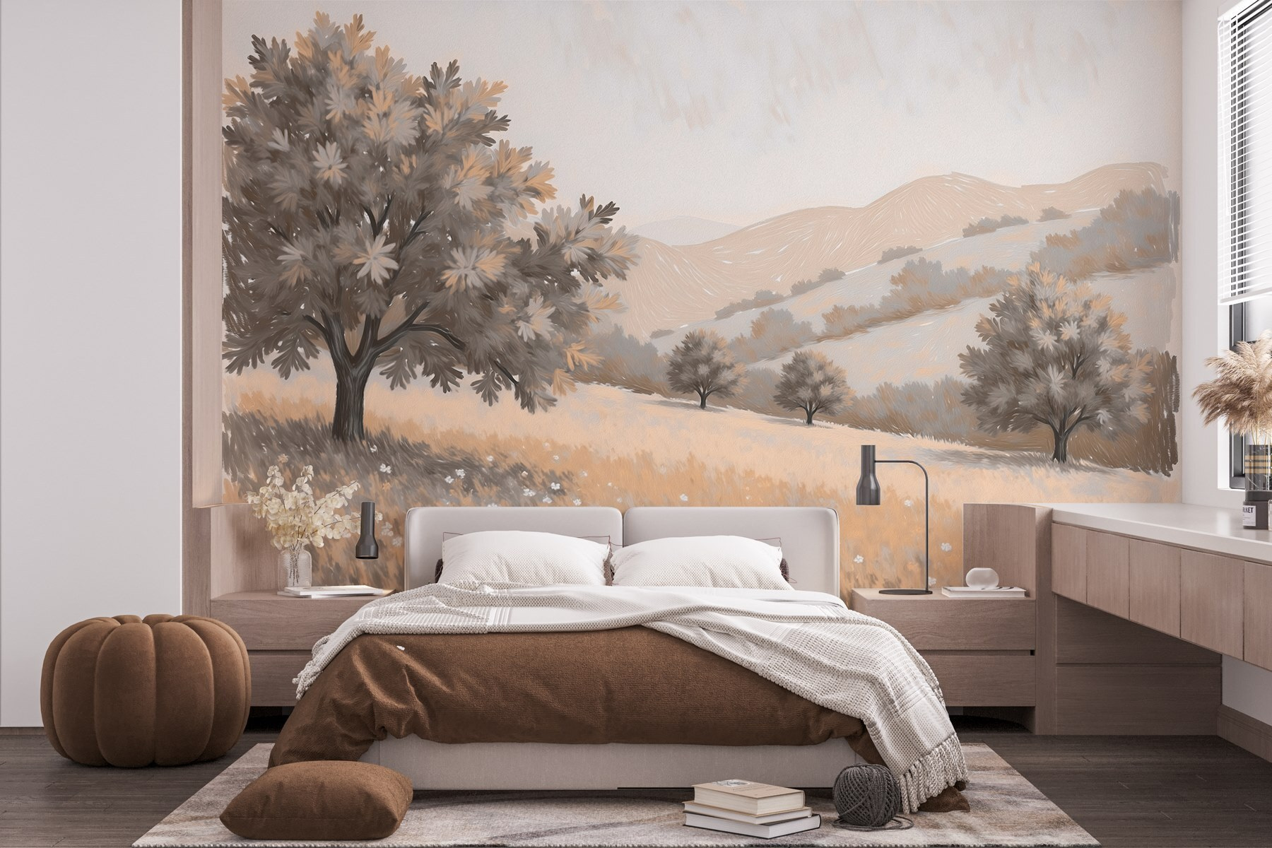 Gestalten Sie Ihren Raum mit einer beruhigenden Wandmalerei, die eine Landschaft mit Bäumen und sanften Hügeln zeigt. Es ist, als würde man eine sanfte Brise ins Haus holen – stellen Sie sich vor, Sie lehnen sich mit Ihrem Kaffee zurück und haben das Gefühl, auf einer ruhigen Wiese zu sein. Dieses Wandbild zieht Sie in eine Welt, in der die Sorgen verblassen. Die subtilen Farbtöne machen es gemütlich, während die Formen der fernen Hügel Tagträume wecken. Perfekt für ein Wohnzimmer, ein Schlafzimmer oder sogar eine ruhige Ecke – es ist das dekorative Äquivalent einer warmen Umarmung. Warum lassen Sie nicht den Charme der Natur auf Ihre Wände wirken? Das ist auf jeden Fall besser, als einfach nur auf Farbe zu starren!