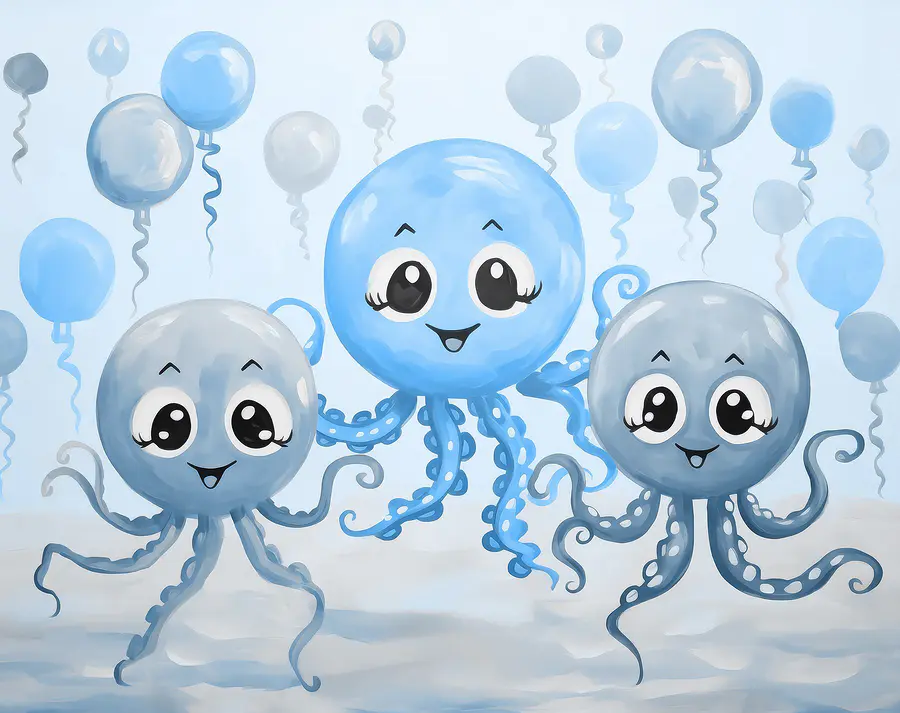 Stellen Sie sich eine Wand vor, die sich wie eine fröhliche Unterwasserparty anfühlt und vor Fröhlichkeit sprüht! Diese Fototapete zeigt bezaubernde Kraken, die verspielt lächeln und bunte Luftballons in der Hand halten. Es sieht so aus, als kämen sie gerade von einer Feier im tiefen blauen Meer. Perfekt für ein Kinderzimmer, einen Spielbereich oder überall dort, wo eine Prise Laune gefragt ist.