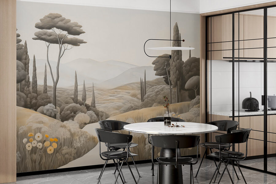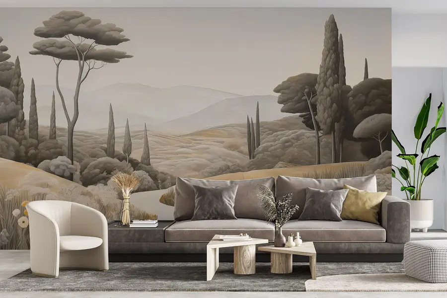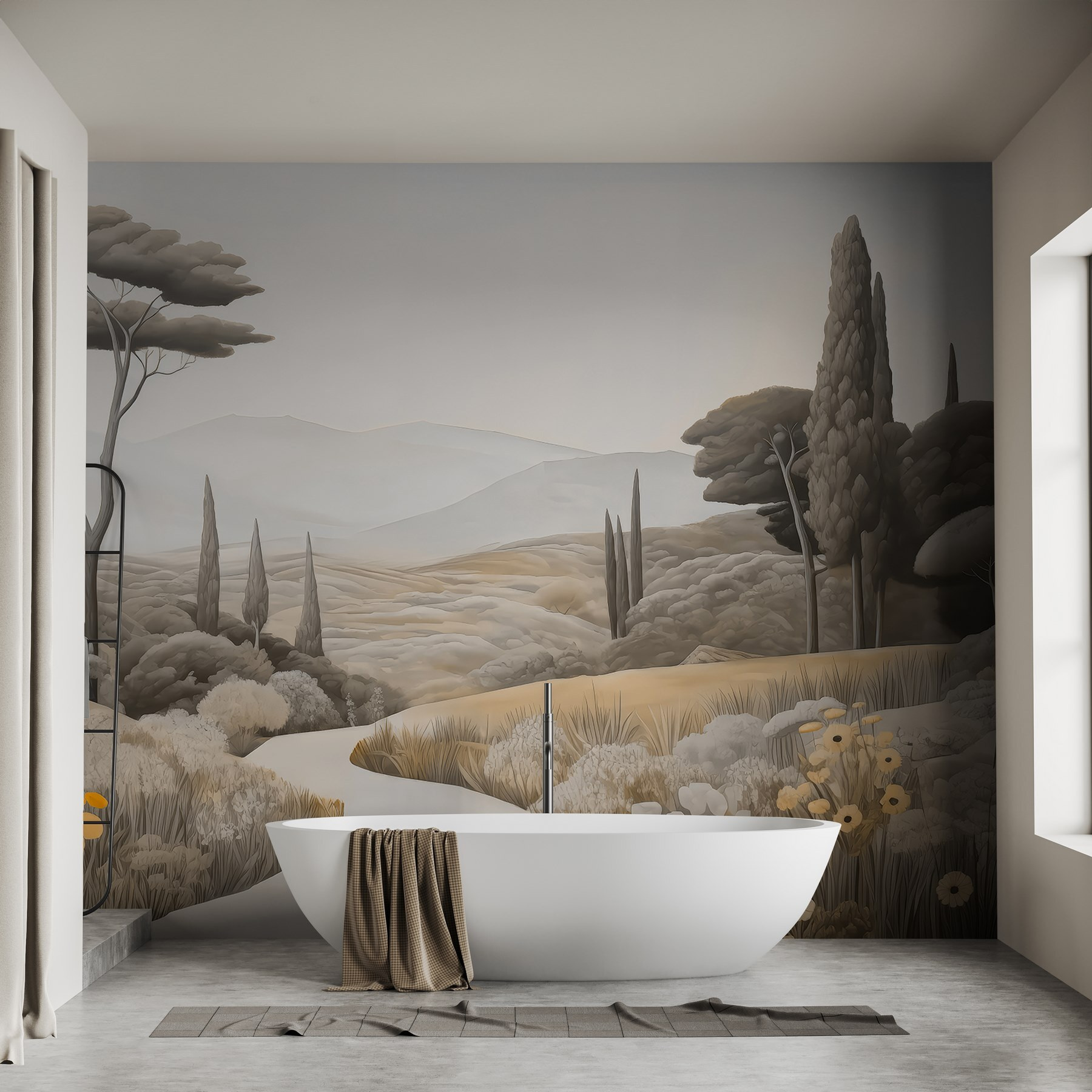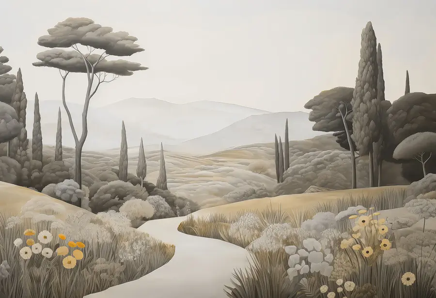 Verwandeln Sie Ihren Raum mit dieser atemberaubenden Fototapete “Landschaft mit einer kurvenreichen Straße und Bäumen”. Es erweckt eine heitere Landschaft zum Leben, die die Natur ins Haus holt, ohne dass es draußen unordentlich ist. Stellen Sie sich vor, wie Sie an einem faulen Sonntag an Ihrem Kaffee nippen und dabei die sanften Hügel und sich wiegenden Bäume betrachten – es ist wie ein Mini-Urlaub direkt an Ihrer Wand. Dieses Wandbild ist perfekt für diese verträumten Momente und hüllt Ihren Raum in warme, erdige Töne und weiche Details, die Sie tief durchatmen lassen. Es flüstert Entspannung und erinnert Sie an friedliche Spaziergänge unter freiem Himmel. Stellen Sie sich die Gespräche vor, die es auslösen könnte, oder die ruhige Stimmung, die es ausstrahlt – was für eine süße Note für jede Nische!