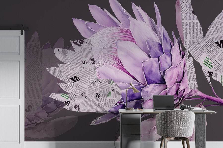 Verwandeln Sie Ihren Raum mit dieser auffälligen Fototapete, die eine atemberaubende lila Blume zeigt, die mit Zeitungsschnipseln verflochten ist. Es ist, als hätte man ein Kunstwerk, das auch Geschichten aus der Vergangenheit erzählt. Stellen Sie sich vor, Sie betreten einen Raum und werden von dieser leuchtenden Blüte begrüßt – es ist nicht nur Dekoration, sondern ein Erlebnis. Dieses Wandbild bringt einen Hauch von Kreativität und einen Hauch von Laune an jede Wand. Es eignet sich perfekt für alle, die die Schönheit der Natur und den Charme von Vintage-Drucken zu schätzen wissen. Bei jedem Blick fühlt es sich an wie ein Hauch frischer Luft in Ihrem Zuhause.