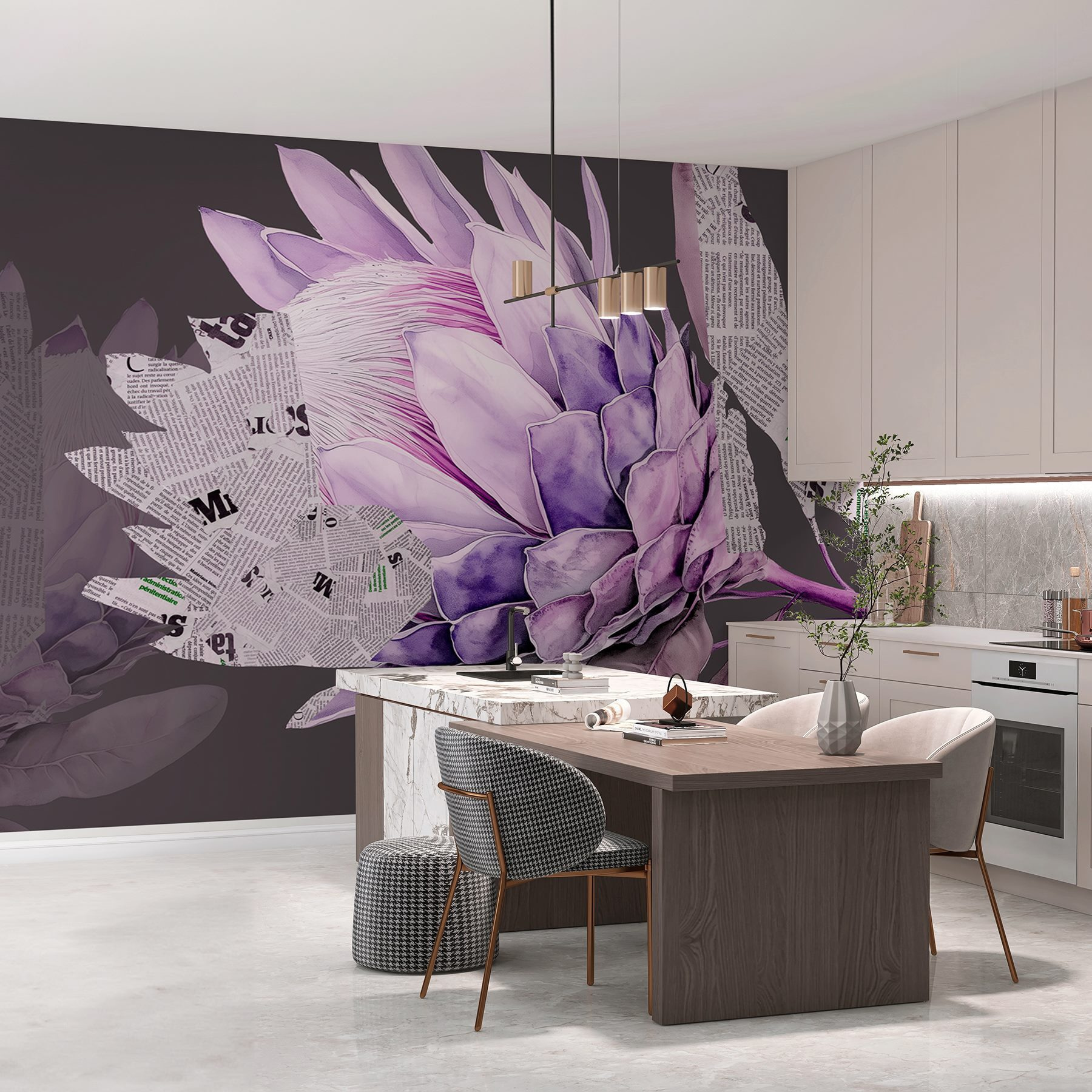 Verwandeln Sie Ihren Raum mit dieser auffälligen Fototapete, die eine atemberaubende lila Blume zeigt, die mit Zeitungsschnipseln verflochten ist. Es ist, als hätte man ein Kunstwerk, das auch Geschichten aus der Vergangenheit erzählt. Stellen Sie sich vor, Sie betreten einen Raum und werden von dieser leuchtenden Blüte begrüßt – es ist nicht nur Dekoration, sondern ein Erlebnis. Dieses Wandbild bringt einen Hauch von Kreativität und einen Hauch von Laune an jede Wand. Es eignet sich perfekt für alle, die die Schönheit der Natur und den Charme von Vintage-Drucken zu schätzen wissen. Bei jedem Blick fühlt es sich an wie ein Hauch frischer Luft in Ihrem Zuhause.