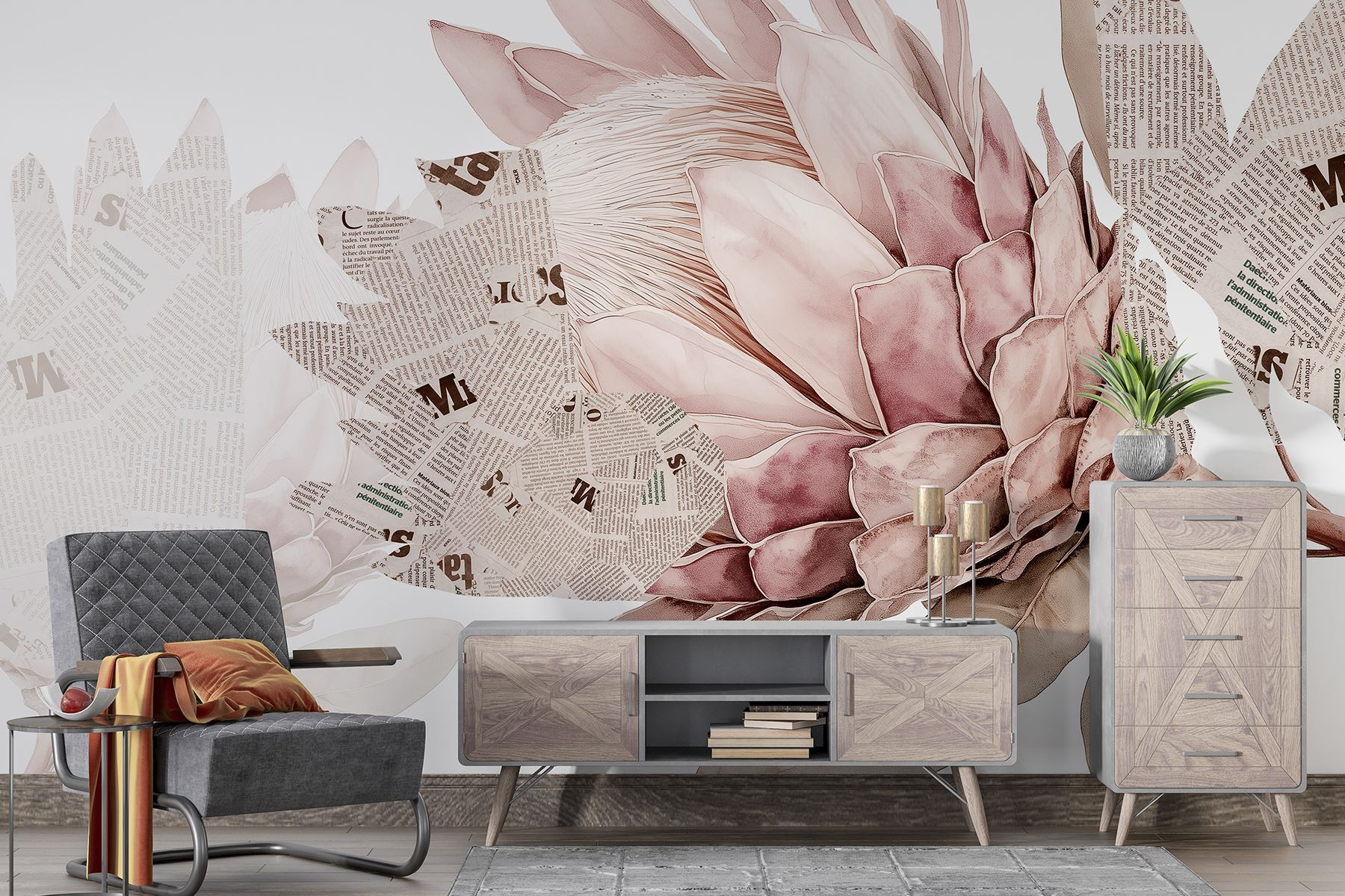 Holen Sie sich einen Hauch von Natur ins Haus mit dieser bezaubernden Fototapete, auf der die herrlichen Blüten mit Zeitungselementen verwoben sind. Es ist wie eine Mischung aus Gartenparty und Kunstgalerie, alles an Ihrer Wand. Stellen Sie sich vor, Sie nippen an Ihrem Kaffee und bewundern, wie die zarten Blütenblätter mit dem fettgedruckten Text tanzen, Gespräche anregen und vielleicht ein wenig träumen. Dieses Wandbild kann jeden Raum in eine gemütliche Ecke verwandeln, die sich lebendig und gleichzeitig stilvoll anfühlt. Es flüstert der Seele zu, lädt Wärme und einen Hauch von Laune ein. Es eignet sich perfekt für Räume, die sich nach einem Hauch von Persönlichkeit und Charme sehnen, und ist eine sanfte Erinnerung daran, dass Schönheit auch an unerwarteten Orten zu finden ist.