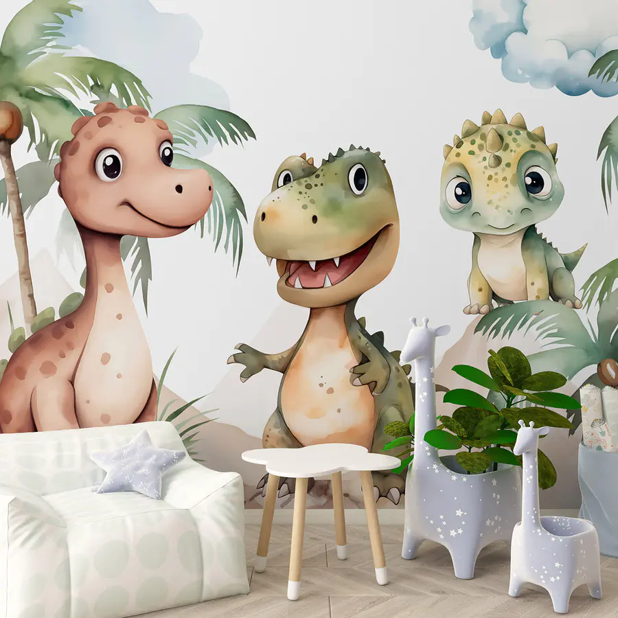 Bringen Sie einen Hauch von Laune in jeden Raum mit dieser entzückenden Fototapete mit liebenswerten Dinosauriern, die auf Felsen stehen. Stellen Sie sich vor, Sie betreten einen Raum, in dem Sie von fröhlichen Dino-Kollegen mit einem breiten, freundlichen Lächeln begrüßt werden – schwer, sich nicht ein wenig leichter zu fühlen, oder? Diese niedlichen Gesichter sind perfekt, um Freude zu wecken und Nostalgie aufkommen zu lassen, egal ob für Sie selbst oder für die kleinen Kinder, die herumlaufen.