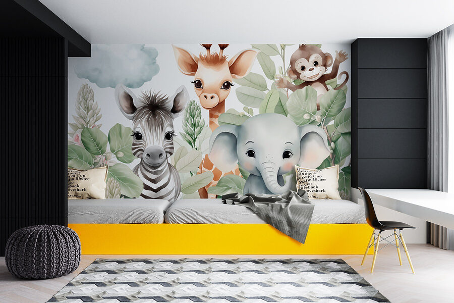 Verwandeln Sie jeden Raum in einen lebendigen Dschungel mit diesem charmanten Wandbild mit verspielten Tieren, die durch üppige Blätter lugen. Stellen Sie sich die Freude auf dem Gesicht eines Kindes vor, wenn es das freundliche Zebra, die neugierige Giraffe und den frechen Affen entdeckt – perfekt für Kinderzimmer oder Spielzimmer. Dieses Wandbild lädt Wärme und Laune ein und bringt die Natur ins Haus. Es ist, als würden die kleinen Tiere der Natur an Ihrer Wand herumtollen! Es lässt sich leicht anbringen und ist hell genug, um Gespräche anzuregen – ein sofortiger Stimmungsaufheller. Wer würde nicht gerne mit dieser fröhlichen Szene aufwachen? Denken Sie nur an die Geschichten, die sich hier entfalten können.