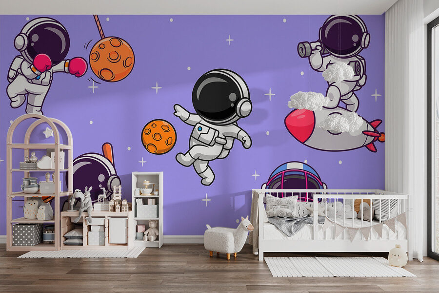 Stellen Sie sich vor, Sie betreten einen Raum, in dem Astronauten eine kosmische Party feiern – klingt lustig, oder? Diese Fototapete fängt diesen spielerischen Geist mit Cartoon-Astronauten ein, die im Weltraum herumhüpfen und alles Mögliche machen, vom Boxen mit Mondgestein bis zum Zoomen auf Raketen. Es ist wie eine lebendige Geschichte, die sich an Ihrer Wand entfaltet, perfekt für Kinder und Junggebliebene. Stellen Sie sich vor, wie sich die ernsten Momente des Alltags aufhellen, wenn Sie einen Blick auf diese schrulligen Weltraumforscher erhaschen, die Sie daran erinnern, Freude und Abenteuer zu erleben. Wer würde sich nicht ein Stückchen Universum wünschen, das mit Glück besprenkelt ist? Verwandeln Sie einen schlichten Raum in einen phantasievollen Zufluchtsort, wo Träume fliegen!
