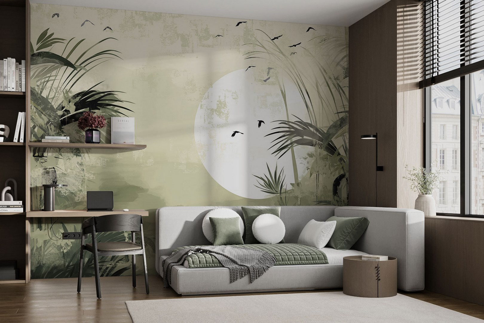 Verwandeln Sie jeden Raum in einen ruhigen Rückzugsort mit diesem Tropenwald-Wandbild – es ist, als ob Sie sich ein Stück Dschungel ins Haus holen, nur ohne die Käfer. Stellen Sie sich vor, Sie schlürfen Ihren Morgenkaffee, während Sie auf üppiges Grün und einen verträumten, übergroßen Mond blicken. Diese Fototapete dekoriert nicht nur, sie vermittelt auch ein Gefühl der Ruhe, perfekt, um nach einem langen Tag zu entspannen. Freunde werden hereinspazieren und sich fühlen, als wären sie in den Regenwald geflüchtet. Es ist die Art von Kulisse, die zu Tagträumen einlädt und Gespräche anregt. Wer hätte gedacht, dass eine Wand jemanden ins Paradies versetzen kann?