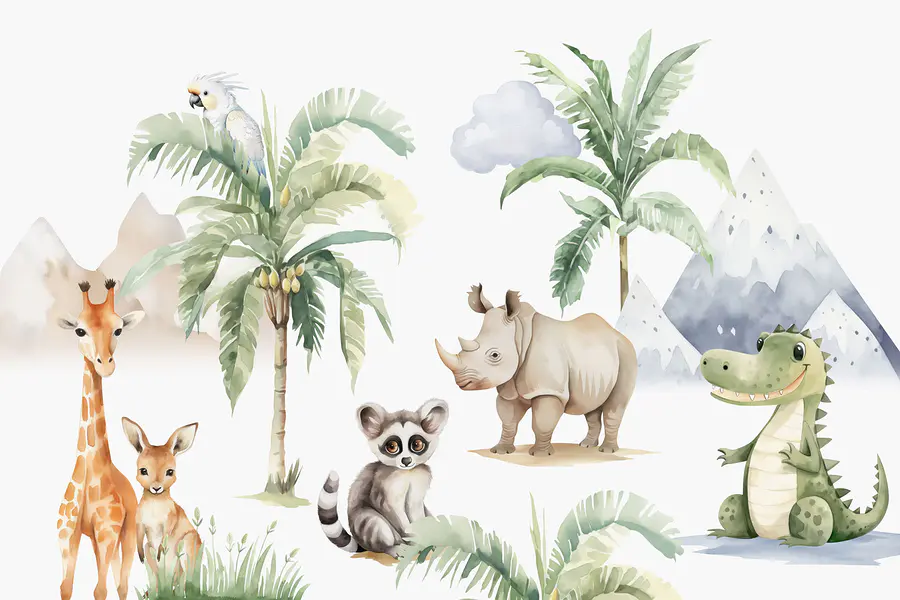 Verwandeln Sie Ihren Raum in einen entzückenden Dschungel mit dieser charmanten Fototapete, die eine schrullige Gruppe von Tieren zeigt. Stellen Sie sich eine neugierige Giraffe vor, die zu Ihnen herüberschaut, ein fröhliches Krokodil, das albern grinst, und ein weises, altes Nashorn, das alles in sich aufnimmt. Es ist ein verspielter Hauch von Natur in Ihrem Zuhause, perfekt für ein Kinderzimmer oder eine gemütliche Leseecke. Die sanften Farben vermitteln ein Gefühl der Ruhe, und wer würde sich nicht gerne von solch freundlichen Gesichtern umgeben fühlen? Stellen Sie sich vor, Sie machen es sich mit einem Buch gemütlich und fühlen sich wie auf einer sanften Safari – Freudensprünge garantiert!