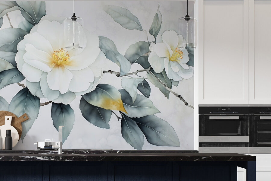 Verwandeln Sie eine triste Wand in eine heitere Zuflucht mit dieser hübschen weißen Blumenwand mit zarten grünen Blättern. Es ist, als würde man einen Hauch von frischer Luft ins Haus holen, ohne dass man etwas gießen muss. Perfekt für die Tage, an denen ein wenig Grün die Stimmung hebt, schafft dieses Wandbild einen beruhigenden Hintergrund für jeden Raum. Stellen Sie sich vor, Sie schlürfen Ihren Morgenkaffee, während Sie diese Schönheit betrachten – es ist praktisch ein Mini-Urlaub. Außerdem ist es ein toller Gesprächsanlass, besonders wenn Gäste Sie nach Ihrem “geheimen Garten” fragen. Wer braucht schon eine komplette Umgestaltung mit Blumen, wenn diese Wandmalerei den Trick macht?