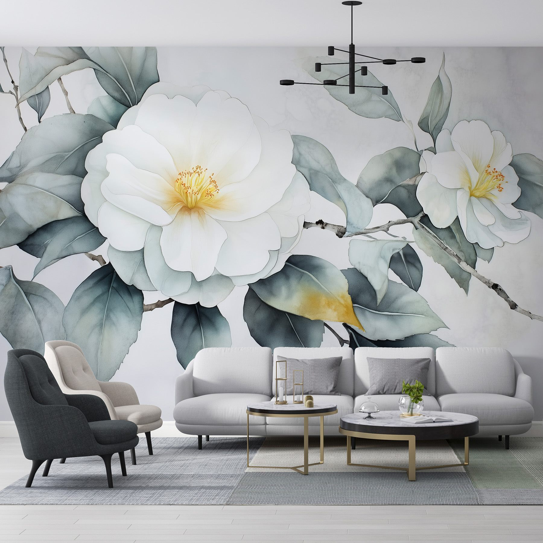 Verwandeln Sie eine triste Wand in eine heitere Zuflucht mit dieser hübschen weißen Blumenwand mit zarten grünen Blättern. Es ist, als würde man einen Hauch von frischer Luft ins Haus holen, ohne dass man etwas gießen muss. Perfekt für die Tage, an denen ein wenig Grün die Stimmung hebt, schafft dieses Wandbild einen beruhigenden Hintergrund für jeden Raum. Stellen Sie sich vor, Sie schlürfen Ihren Morgenkaffee, während Sie diese Schönheit betrachten – es ist praktisch ein Mini-Urlaub. Außerdem ist es ein toller Gesprächsanlass, besonders wenn Gäste Sie nach Ihrem “geheimen Garten” fragen. Wer braucht schon eine komplette Umgestaltung mit Blumen, wenn diese Wandmalerei den Trick macht?
