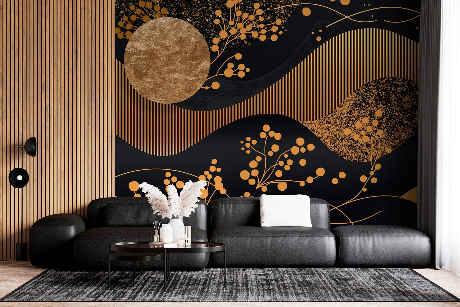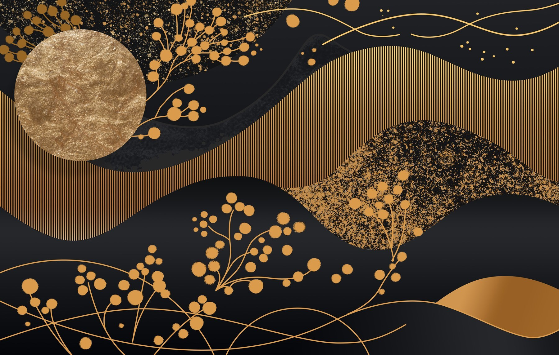 Verwandeln Sie jeden Raum in einen gemütlichen Rückzugsort mit dieser atemberaubenden Fototapete “Elegante Muster auf einer dunklen Leinwand”. Stellen Sie sich vor, Sie stehen in Ihrem Zimmer, denn diese Fototapete fängt einen faszinierenden Tanz aus fließenden Linien und charmanten Clustern ein, die nur darauf warten, ein Gespräch zu entfachen. Die kräftigen Farben strahlen eine ruhige, raffinierte Atmosphäre aus, die sich perfekt für eine entspannende Ecke oder sogar einen lebhaften Wohnbereich eignet. Gäste könnten sich von den Mustern angezogen fühlen und über deren Bedeutung nachdenken – oder einfach nur die Schönheit bewundern.
