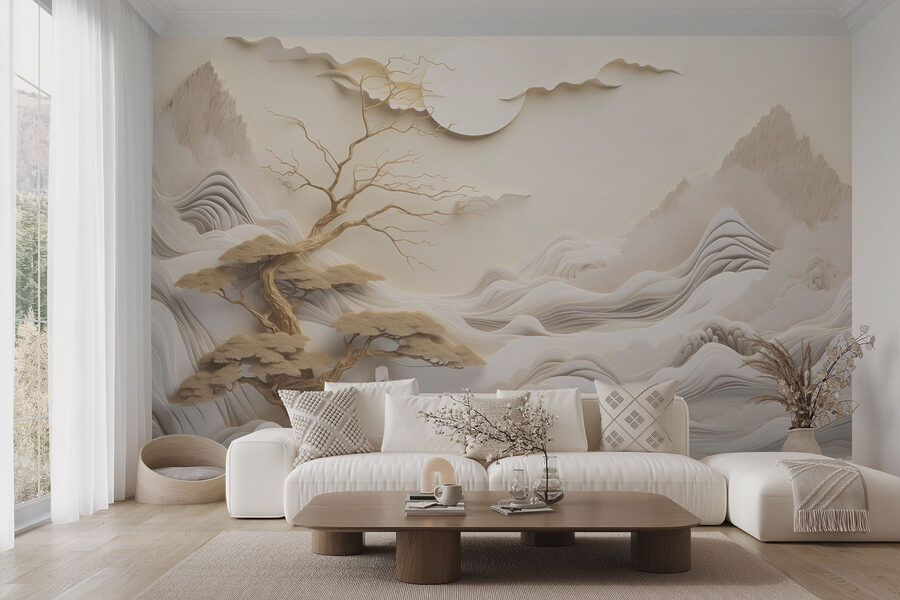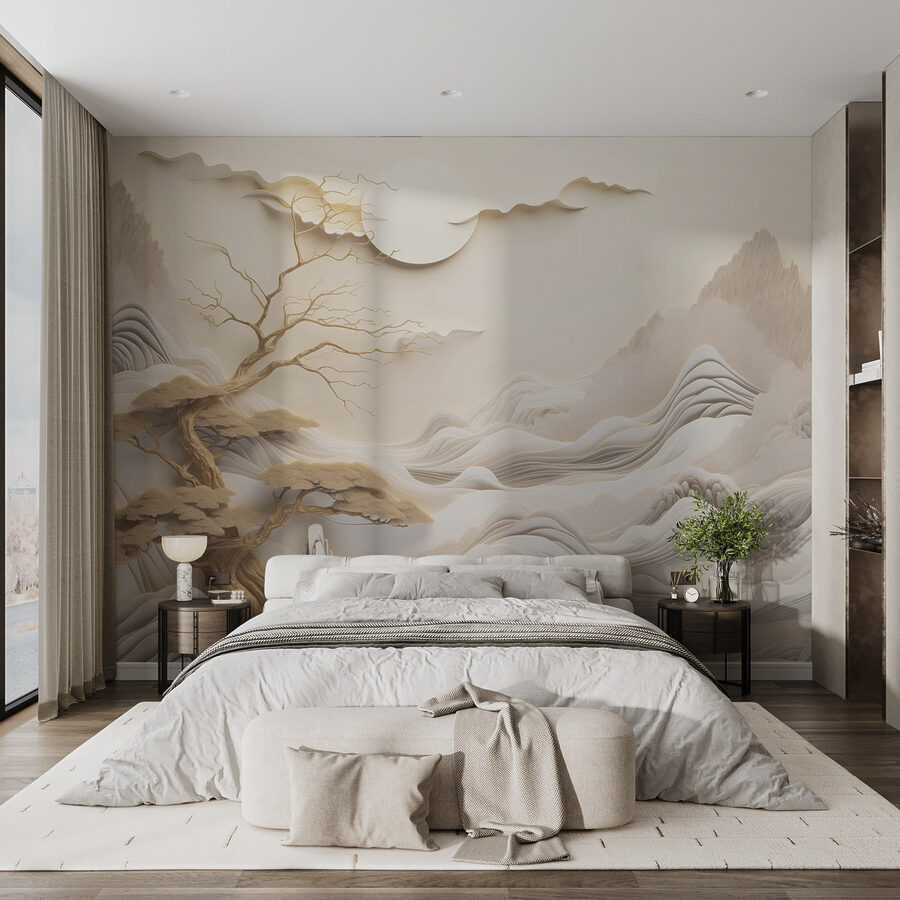 Verwandeln Sie jeden Raum in einen ruhigen Zufluchtsort mit dieser atemberaubenden Fototapete, die einen Baum, Berge, Wolken und eine große Sonne zeigt. Es ist, als ob man sich den Blick auf die Berge nach drinnen holen könnte, ohne dafür eine Wanderung auf sich nehmen zu müssen. Stellen Sie sich vor, Sie schlürfen einen Kaffee und genießen das sanfte Licht der Sonne, die durch die Berge scheint. Es eignet sich perfekt für ein Wohnzimmer oder eine gemütliche Leseecke und sorgt für Gesprächsstoff, der die Gäste über die Geheimnisse des Lebens nachdenken lässt. Außerdem schaffen die gedämpften Töne eine ruhige Atmosphäre, die es leicht macht, sich zu entspannen – wer würde sich nicht ein wenig Umarmung durch die Natur wünschen? Ganz ehrlich, dieses Wandbild ist die beste Kulisse für faule Sonntage oder spontane Tanzpartys.