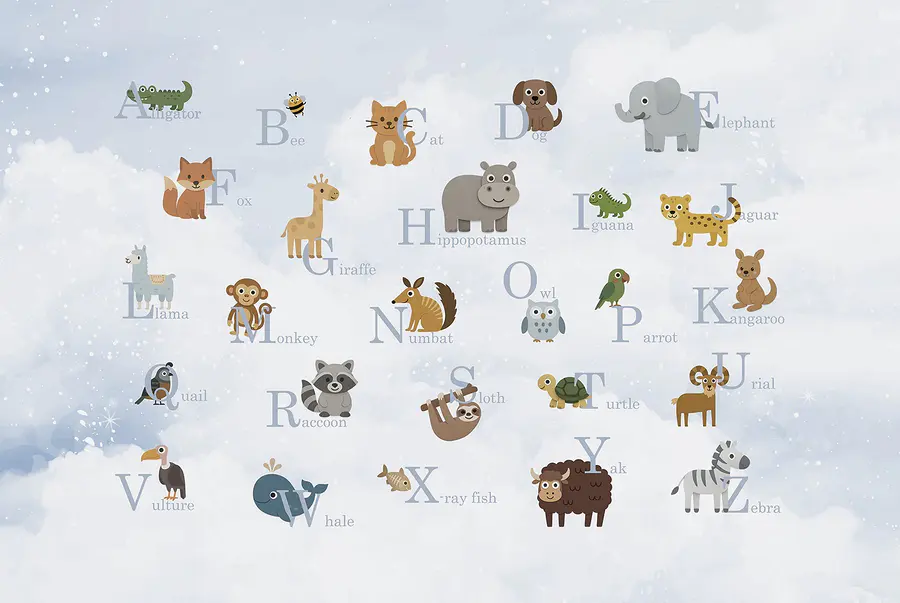 Verwandeln Sie den Raum Ihres Kindes in einen lebendigen Dschungel aus Spaß mit diesem entzückenden Wandbild, das eine Reihe von charmanten Tieren mit den entsprechenden Buchstaben zeigt. Es ist wie ein Zoo und ein Alphabet in einem! Ein verspielter Fuchs, eine alberne Giraffe und eine weise Eule bringen ein Abenteuer direkt an Ihre Wände – das weckt garantiert Neugierde und Kichern.
