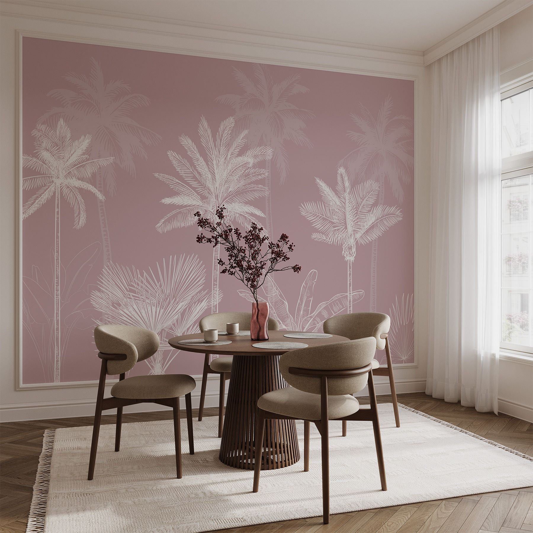 Verwandeln Sie jeden Raum mit dieser bezaubernden Fototapete “Group of Palm Trees”. Stellen Sie sich vor, dass Sie jedes Mal, wenn Sie Ihren Raum betreten, in einen ruhigen, tropischen Ort eintauchen. Der weiche, gedämpfte rosa Hintergrund lädt zu einer gemütlichen Atmosphäre ein und ist die perfekte Kulisse für einen entspannten Abend nach einem langen Tag. Es ist, als würde in Ihrer Wohnung plötzlich eine Meeresbrise wehen – nur ohne den Sand in Ihren Schuhen. Die kunstvoll gezeichneten Palmen verleihen einen Hauch von Eleganz, nehmen sich aber nicht zu ernst. Ob im Wohnzimmer oder im Arbeitszimmer – diese verspielte Anspielung auf die Natur lässt die Wände lebendig wirken. Perfekt zum Tagträumen!