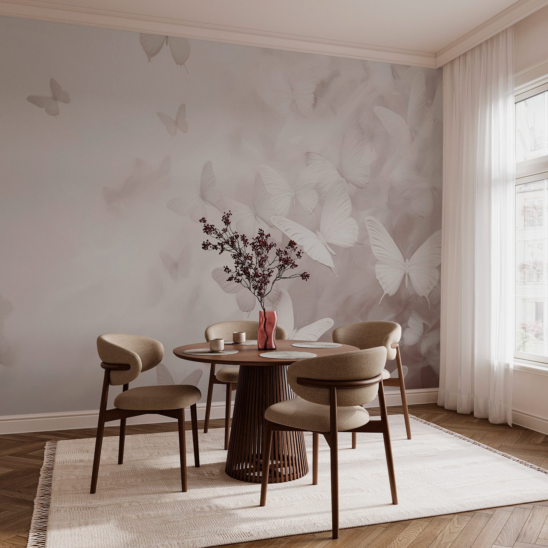 Verwandeln Sie jeden Raum in einen ruhigen Zufluchtsort mit dieser verträumten Fototapete mit Schmetterlingen im Flug. Stellen Sie sich vor, Sie treten in eine Welt ein, in der diese zarten Geschöpfe über einen weichen, nebligen Hintergrund tanzen. Es ist wie eine sanfte Erinnerung daran, dass Schönheit auch in alltäglichen Momenten gefunden werden kann. Stellen Sie sich eine gemütliche Leseecke oder eine ruhige Schlafzimmerwand vor, an der Sie dem Chaos des Lebens entfliehen können – dieses Wandbild bietet genau das. Es ist perfekt, um eine friedliche Atmosphäre zu schaffen oder ein wenig Laune zu verbreiten. Wer möchte nicht jedes Mal, wenn er vorbeigeht, diese flatternde Freude spüren? Es ist an der Zeit, die Schmetterlinge ihre Flügel ausbreiten zu lassen und Ihren Raum zu erhellen!