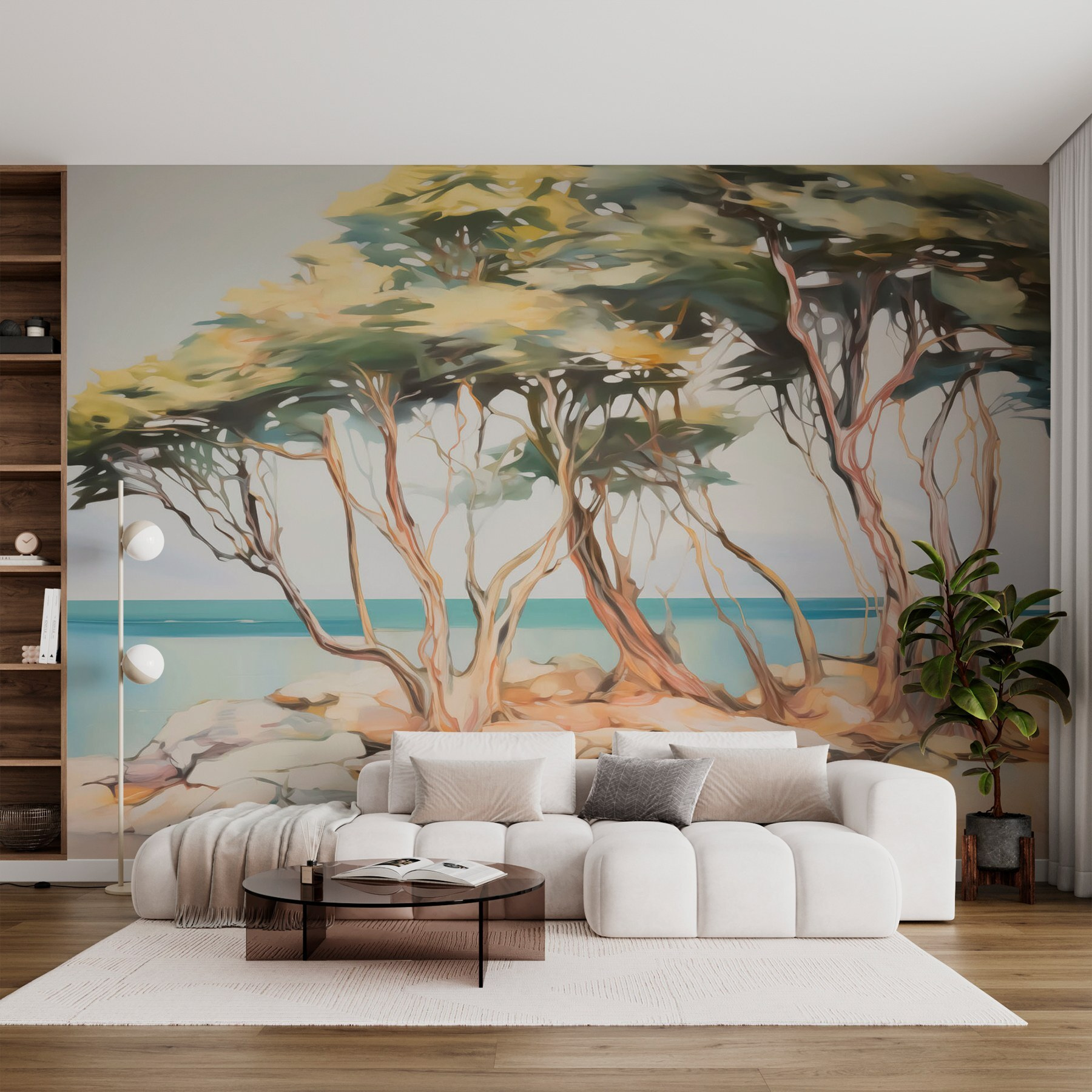 Stellen Sie sich vor, Sie betreten einen Raum und haben sofort das Gefühl, auf eine gemütliche Felseninsel zu spazieren – wie perfekt ist das? Diese Fototapete zeigt eine bezaubernde Gruppe von Bäumen an der Küste, die Geschichten von sanften Brisen und Meereswellen erzählen. Die sanften Aquarellfarben verleihen ihm einen Hauch von Laune und Verträumtheit, dem man nur schwer widerstehen kann. Stellen Sie es sich in einem Wohnzimmer oder einem ruhigen Schlafzimmer vor, wo es zu Tagträumen und faulen Nachmittagen einlädt. Es ist wie ein Mini-Urlaub an der Wand, der jeden daran erinnert, die Seele baumeln zu lassen und die Schönheit zu genießen. Wer würde sich nicht jeden Tag eine solche Auszeit wünschen?