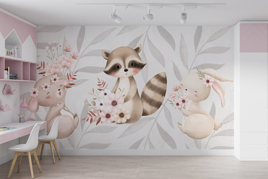 Verwandeln Sie eine triste Wand in ein skurriles Refugium mit dieser entzückenden Fototapete, die einen Waschbären und einen Hasen zeigt, die jeweils einen Blumenstrauß halten. Es ist, als ob Sie sich ein kleines Stück Natur in Ihr Zuhause holen, wo diese charmanten Tiere vor Ihren Augen lebendig zu werden scheinen. Stellen Sie sich vor, Sie betreten einen Raum und spüren das sofortige Lächeln Ihrer Gäste. Die neutralen Töne und die sanften Grafiken schaffen eine gemütliche Atmosphäre, die sich perfekt für Kinderzimmer, Spielzimmer oder sogar für die ruhige Leseecke eignet, die Sie immer wieder verschönern wollen. Jeder Blick auf diese bezaubernden Tiere kann ein wenig Freude auslösen und Sie daran erinnern, dass es im Leben manchmal auf die kleinen Dinge ankommt – wie Blumen und pelzige Freunde. Sie sorgen für Gesprächsstoff und gute Laune, und ganz ehrlich: Wer könnte diesen niedlichen Gesichtern widerstehen?