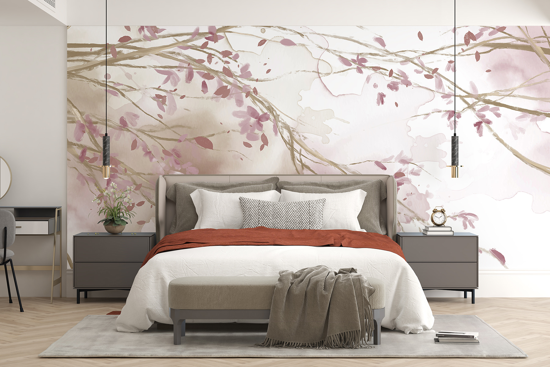 Stellen Sie sich dieses atemberaubende Wandbild “Fototapeten w07919v1” vor, das Ihr Wohnzimmer oder Ihr Schlafzimmer ziert… Es ist, als hätte man einen immerwährenden Frühling direkt zu Hause! Die zarten Kirschblütenzweige, die sich anmutig ineinander verschlingen, gehören zu verschiedenen charmanten Kategorien wie Japanischer Garten, Natur und Aquarell – mit einem Hauch von Holzoptik. Die zarten Pastellfarben und verträumten Aquarelle geben Ihnen das Gefühl, in einem friedlichen Garten zu sein.