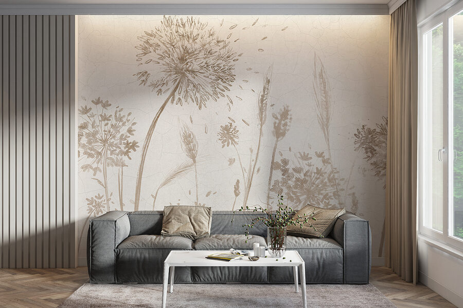 Stellen Sie sich vor, Sie bringen die Ruhe und Schönheit der Natur in Ihr Zimmer. Das ist es, was “Fototapeten w07921” tut – es ist wie ein Hauch von frischer Luft für Ihre Wände. Stellen Sie sich zarte Wildblumen und anmutige Pusteblumen vor, die in sanften Braun- und Beigetönen gezeichnet sind und sich wie in einer Sommerbrise wiegen. Die Risse im Hintergrund verleihen dem Bild einen rustikalen Vintage-Charme, als ob es von der Zeit geküsst worden wäre…