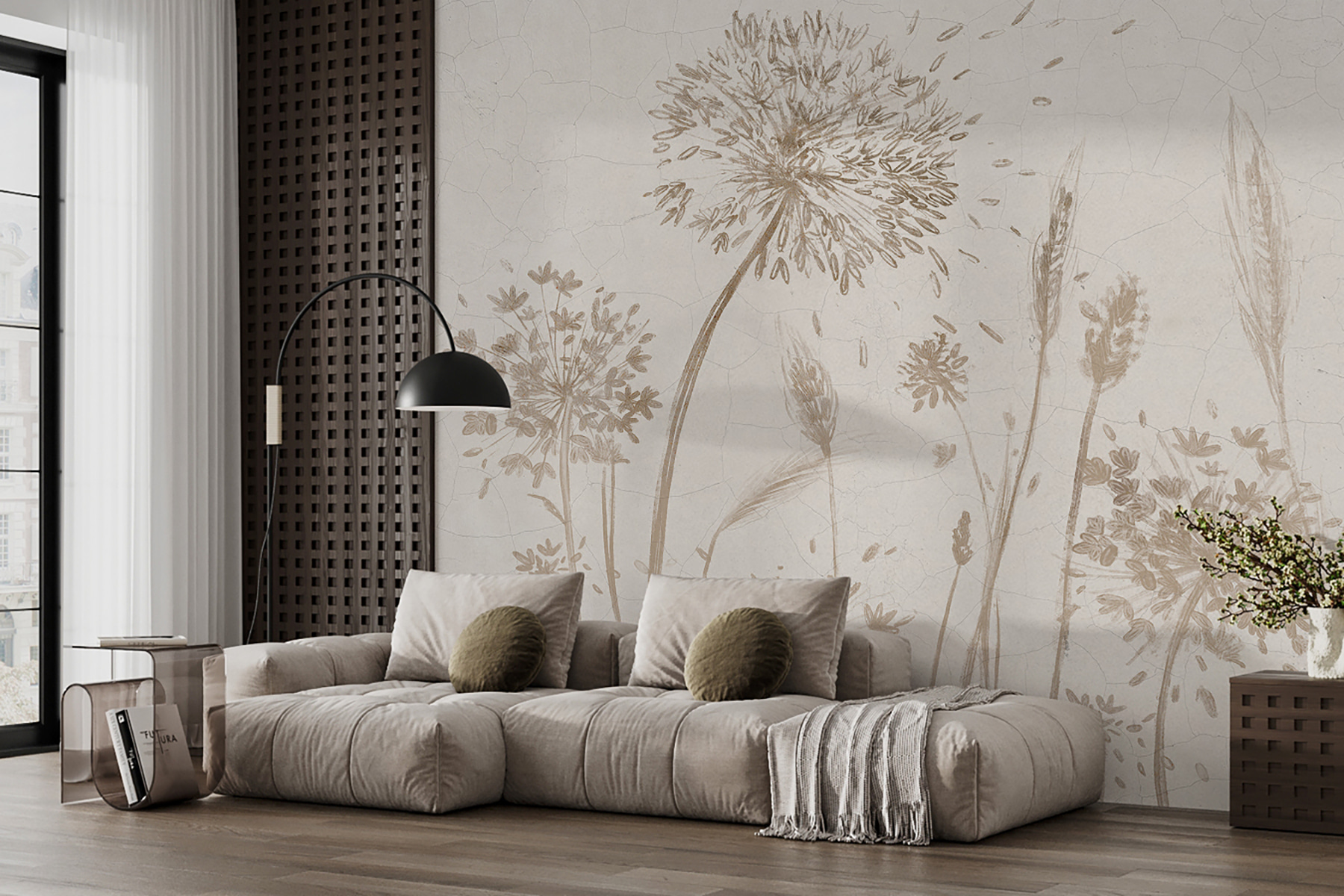 Stellen Sie sich vor, Sie bringen die Ruhe und Schönheit der Natur in Ihr Zimmer. Das ist es, was “Fototapeten w07921” tut – es ist wie ein Hauch von frischer Luft für Ihre Wände. Stellen Sie sich zarte Wildblumen und anmutige Pusteblumen vor, die in sanften Braun- und Beigetönen gezeichnet sind und sich wie in einer Sommerbrise wiegen. Die Risse im Hintergrund verleihen dem Bild einen rustikalen Vintage-Charme, als ob es von der Zeit geküsst worden wäre…