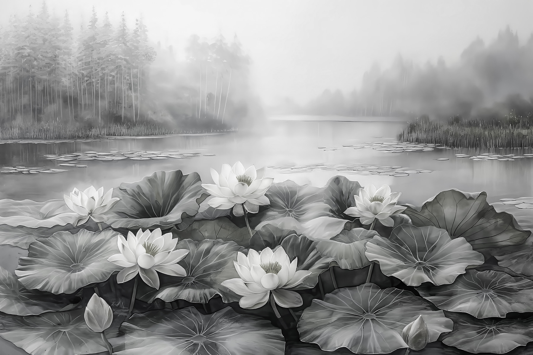 Verwandeln Sie eine schlichte Wand in einen Ort der Ruhe mit dieser atemberaubenden Fototapete mit weißen Blumen, die auf einem ruhigen See tanzen. Stellen Sie sich vor, Sie kommen nach Hause, ziehen Ihre Schuhe aus und werden von der sanften Eleganz dieser Blüten begrüßt. Das sanfte Plätschern und die neblige Kulisse haben etwas Beruhigendes – perfekt, um sich nach einem langen Tag zu entspannen. Ob in einem gemütlichen Wohnzimmer oder einem ruhigen Schlafzimmer, dieses Wandbild bringt einen Hauch von Natur ins Haus und lässt es wie einen friedlichen Rückzugsort erscheinen. Wer würde sich das nicht wünschen? Denken Sie nur an all die Momente, in denen Sie die Schönheit der Natur genießen können – vielleicht bei einer ruhigen Tasse Tee oder mit einem guten Buch. Es ist, als hätte man ein Stück Natur direkt zu Hause, das ein bisschen Ruhe in den Alltag bringt.
