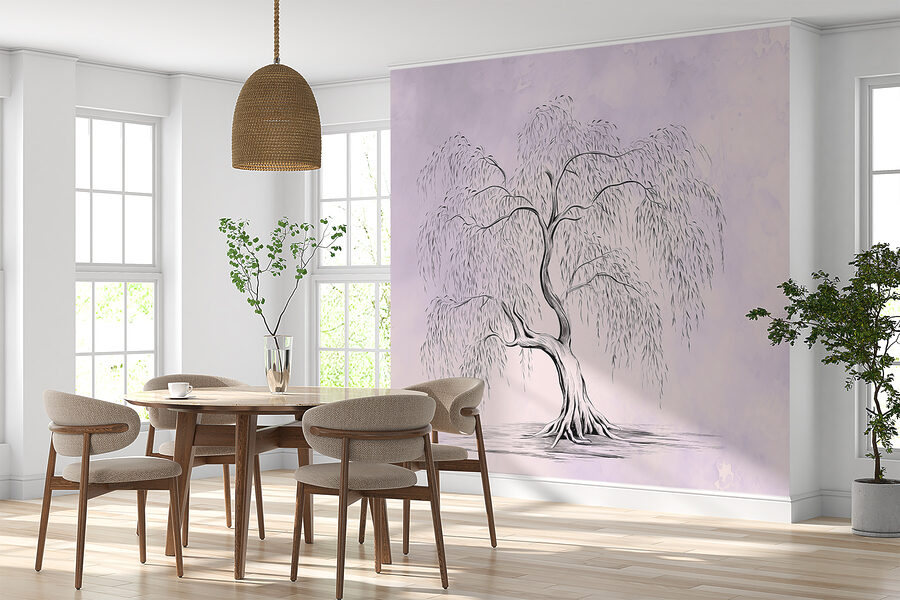 Der weiche, verwaschene Hintergrund mit seinen Lavendel- und Cremetönen sorgt für eine heitere, fast magische Stimmung. Er verwandelt einen Raum sofort in einen beruhigenden Rückzugsort. Können Sie sich vorstellen, jeden Tag mit diesem Bild aufzuwachen? Oder vielleicht in einer gemütlichen Leseecke, wo Sie sich in ein Buch vertiefen können, während der friedliche Baum Ihnen Gesellschaft leistet? Er hat etwas so Erdendes und Beruhigendes an sich.