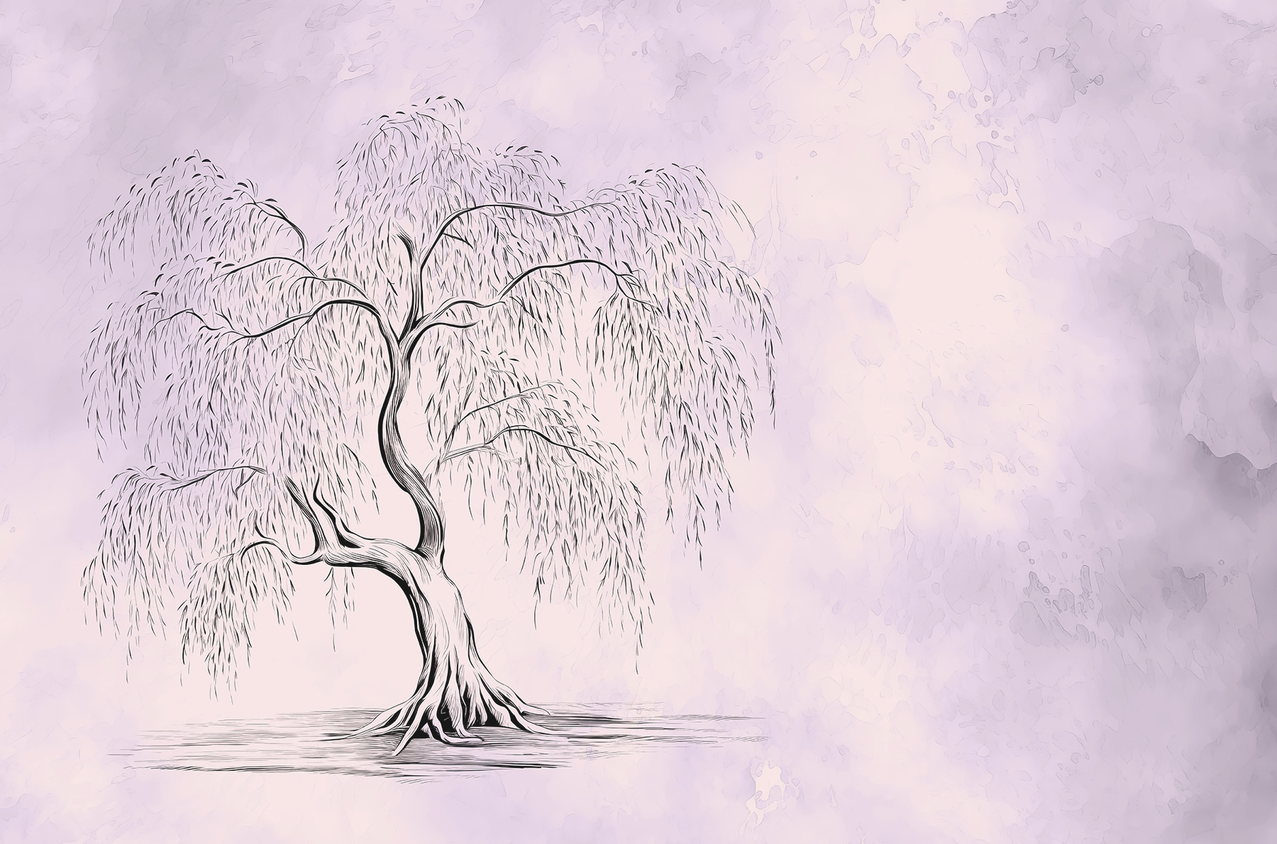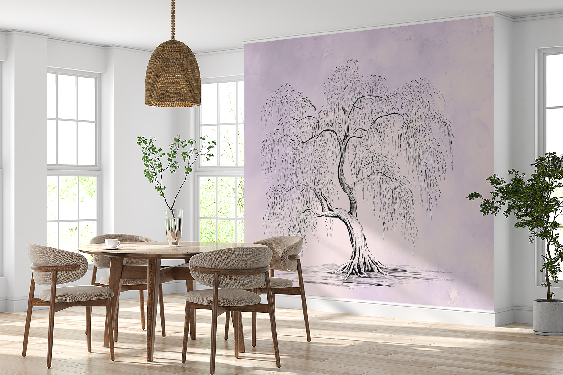 Der weiche, verwaschene Hintergrund mit seinen Lavendel- und Cremetönen sorgt für eine heitere, fast magische Stimmung. Er verwandelt einen Raum sofort in einen beruhigenden Rückzugsort. Können Sie sich vorstellen, jeden Tag mit diesem Bild aufzuwachen? Oder vielleicht in einer gemütlichen Leseecke, wo Sie sich in ein Buch vertiefen können, während der friedliche Baum Ihnen Gesellschaft leistet? Er hat etwas so Erdendes und Beruhigendes an sich.