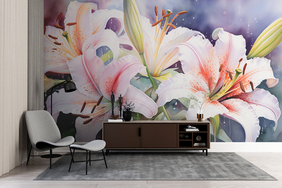 Verschönern Sie jeden Raum mit dem Wandbild Lilies in Bloom: Die Schönheit der Natur. Diese atemberaubende Fototapete zeigt leuchtende Lilien in zarten Rosatönen und Weiß und verwandelt Ihren Raum in eine friedliche Oase. Stellen Sie sich vor, Sie betreten einen Raum, in dem florale Träume an den Wänden tanzen. Es ist, als ob man sich ein Stück Natur ins Haus holt, ohne dass man eine Gießkanne braucht. Dieses Wandbild eignet sich perfekt für gemütliche Ecken oder als Blickfang. Es fängt das erfrischende Gefühl des Frühlings ein – jeder Tag fühlt sich an, als würden Sie in einem Garten aufwachen. Freunde werden es mit Sicherheit bewundern, und wer weiß, vielleicht weckt es ja sogar den Neid auf die Pflanzen!
