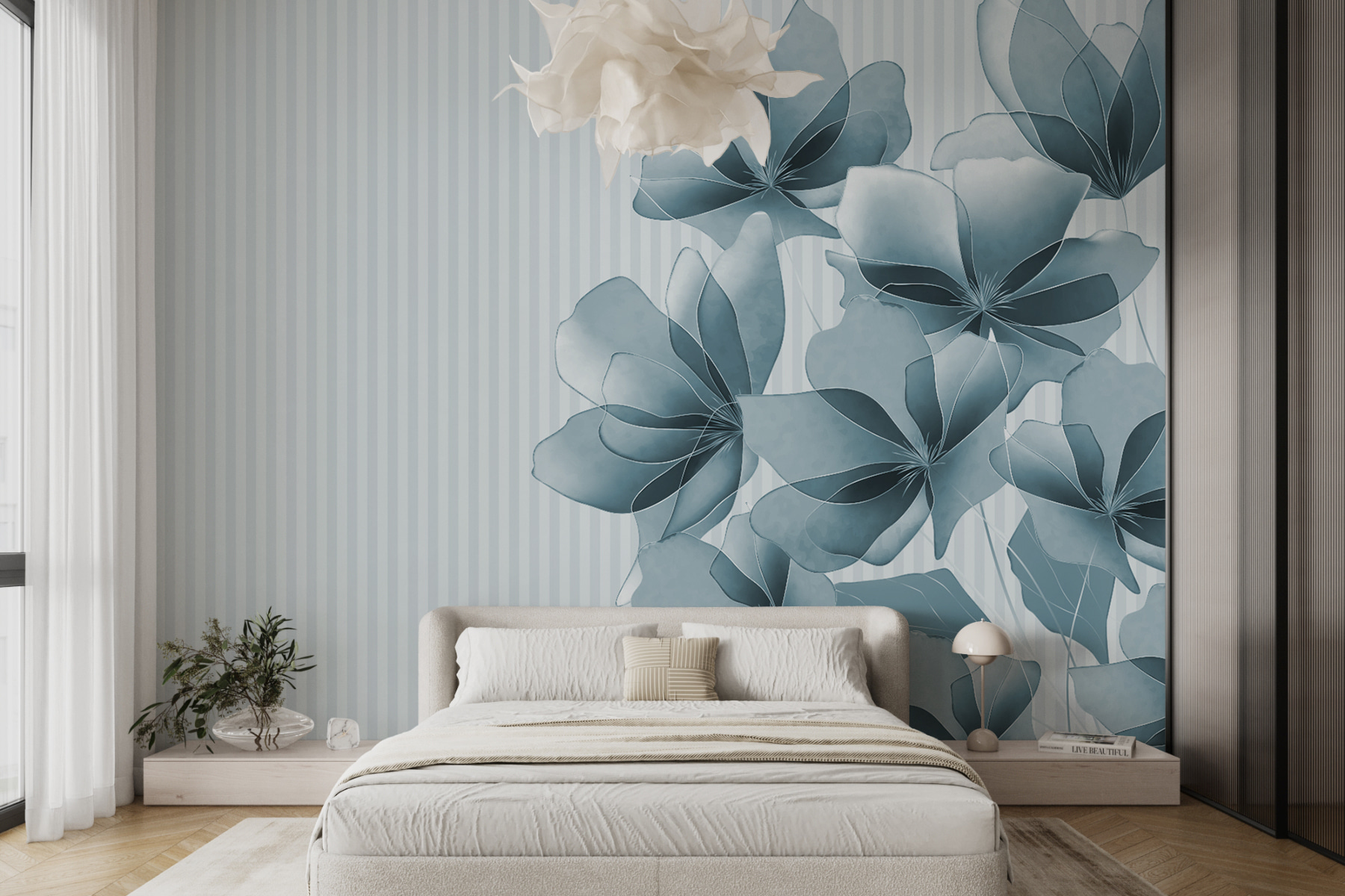 Verwandeln Sie jeden Raum mit der Fototapete “Silver Flowers Dancing on Stripes”. Stellen Sie sich einen ruhigen Garten vor, in dem sich zarte Blumen sanft in der Brise wiegen. Es ist, als würde man die Natur ins Haus holen, ohne den Schmutz! Die dezenten Streifen verleihen dem Bild einen Hauch von Charme und schaffen einen beruhigenden Hintergrund, der sich perfekt für gemütliche Ecken oder lebhafte Wohnzimmer eignet. Stellen Sie sich vor, Sie nippen an Ihrem Morgenkaffee, während Sie sich in dieser beruhigenden Stimmung sonnen – wie ein Hauch frischer Luft für Ihre Wände. So können Sie Ihre Einrichtung auf einfache Weise auffrischen und Freude verbreiten. Und wer wünscht sich nicht ein wenig floralen Zauber in seinem Zuhause?