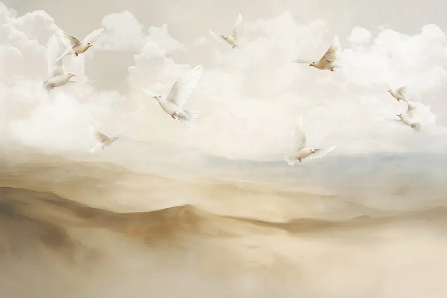 Wollten Sie sich schon immer einmal wie in einem Traum fühlen? “Fototapeten w08143” könnte genau das Richtige für Sie sein! Stellen Sie sich das vor: Ruhige Wolken, die sanft über Ihre Wand ziehen, mit sanftem Tageslicht, das durchscheint – es ist, als hätten Sie den Himmel in Ihrem Zimmer. Und diese Tauben, sie scheinen fast bereit zu sein, herauszuflattern und ein bisschen Frieden in Ihren Raum zu bringen. Stellen Sie sich vor, Sie machen es sich nach einem langen Tag auf der Couch gemütlich, betrachten dieses wunderschöne Wandbild und spüren, wie sich ein Gefühl der Ruhe über Sie legt. Es ist mehr als nur Dekoration, es ist eine Flucht… in Ihrem eigenen Zuhause!