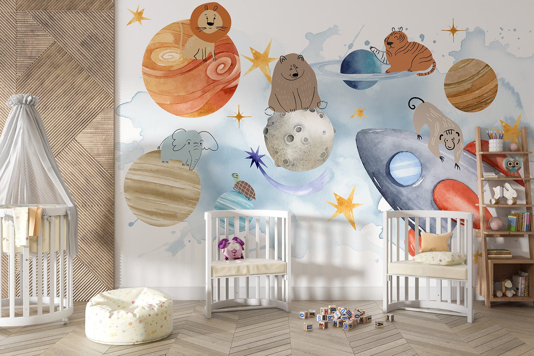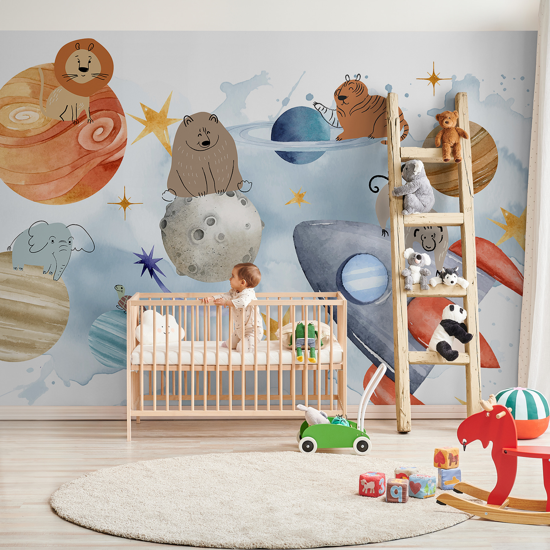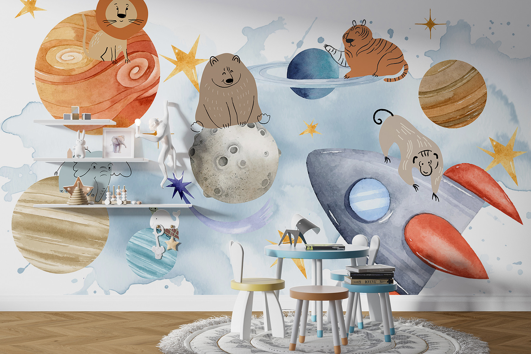 Entfliehen Sie mit diesem Wandbild “Gruppe von Tieren im Weltraum” in eine skurrile Welt! Stellen Sie sich ein Zimmer vor, in dem Löwen, Bären und Tiger wie erfahrene Astronauten um Planeten kreisen. Das Wandbild ist perfekt, um einen Hauch von Galaxie zu versprühen – mit planetarischen Pfotenabdrücken und allem Drum und Dran. Stellen Sie sich vor, Sie wachen mit einem Löwen auf, der auf dem Jupiter sitzt, oder einer Schildkröte, die eine kosmische Runde dreht. Ob im Kinderzimmer oder im Büro – es ist, als hätte man einen Zoo im Orbit. Ihre Wände werden Ihnen für dieses Abenteuer danken. Bereit zum Abheben?