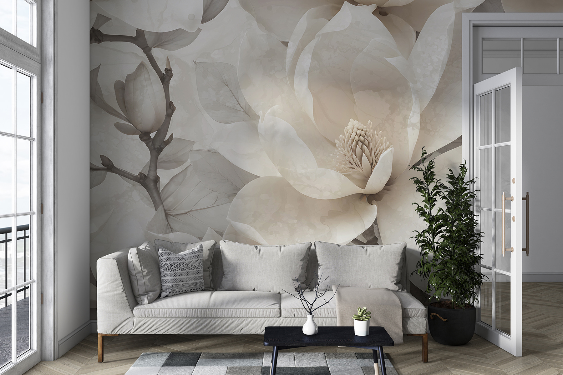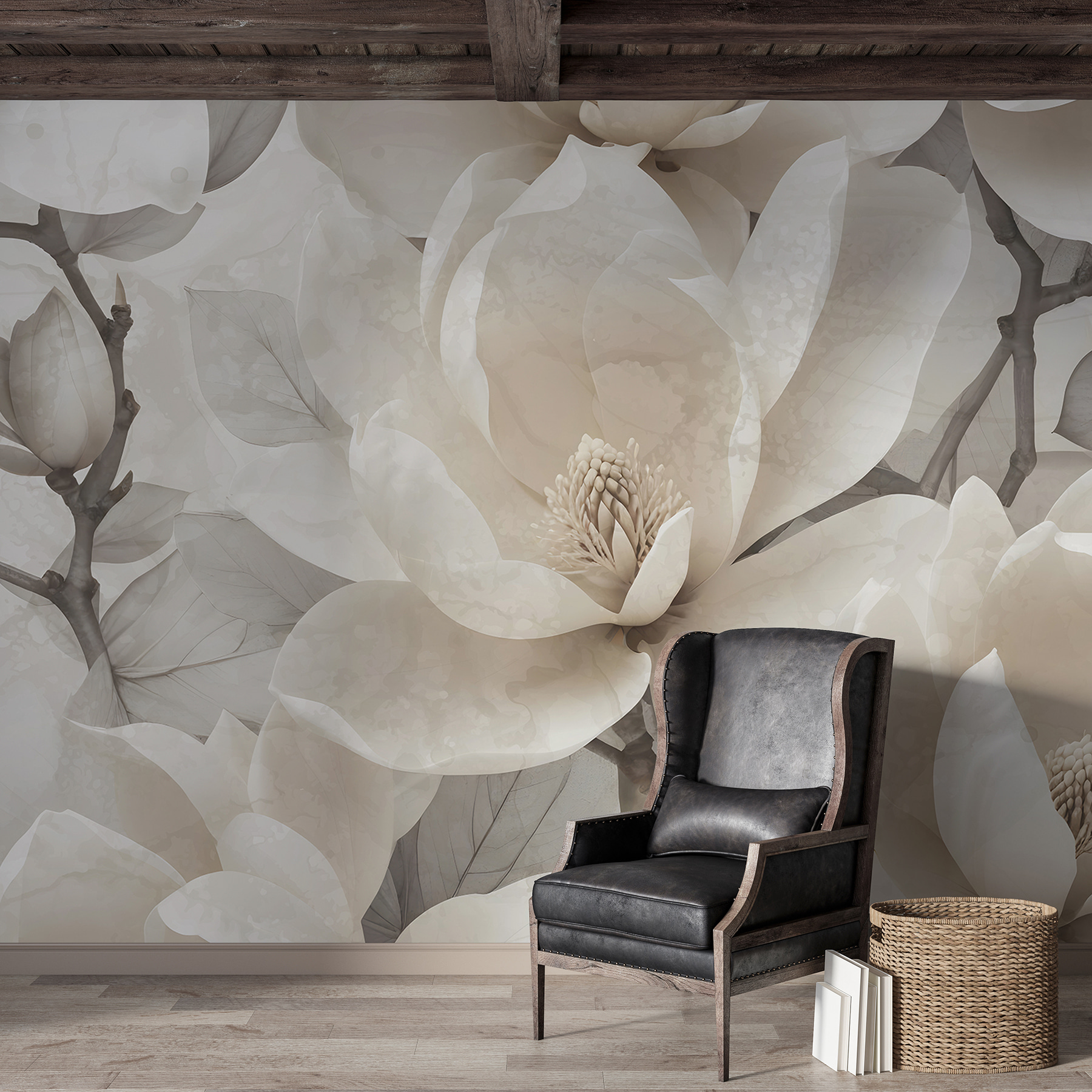 Stellen Sie sich vor, Sie betreten einen Raum und haben das Gefühl, einen friedlichen Magnoliengarten zu betreten, ohne das Haus zu verlassen. Diese Fototapete mit eleganten Magnolien in sanften, gedämpften Tönen ist wie ein beruhigendes Flüstern, das den Raum sofort in Gelassenheit hüllt. Es ist perfekt, wenn Sie an einem ruhigen Nachmittag Ihr Lieblingsbuch lesen oder eine warme Tasse Tee trinken möchten. Die Blüten sind so naturgetreu, dass man vergessen könnte, dass sie nicht in 3D sind! Ideal für alle, die die Natur lieben, aber keinen grünen Daumen haben. Versprich einfach, dass du sie nicht gießt!