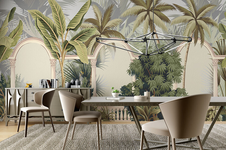 Stellen Sie sich vor, Sie betreten Ihr Zimmer und haben das Gefühl, in eine heitere tropische Oase eingetreten zu sein. Dieses Wandbild mit seinen anmutigen Palmen, die sich sanft vor eleganten Bögen wiegen, schafft diese Atmosphäre mühelos. Es ist wie Ihre eigene kleine Flucht – ein Fenster zu einem üppigen Dschungel, ohne das Haus zu verlassen. Perfekt, um einen Hauch von Natur und einen Hauch von Abenteuer in Ihren Raum zu bringen. Wer hätte gedacht, dass eine Wand Ihr Ticket ins Paradies sein kann? Fügen Sie ein paar bequeme Sitzgelegenheiten hinzu, und schon können Sie sich in Tagträumen von der Inselbrise verlieren.