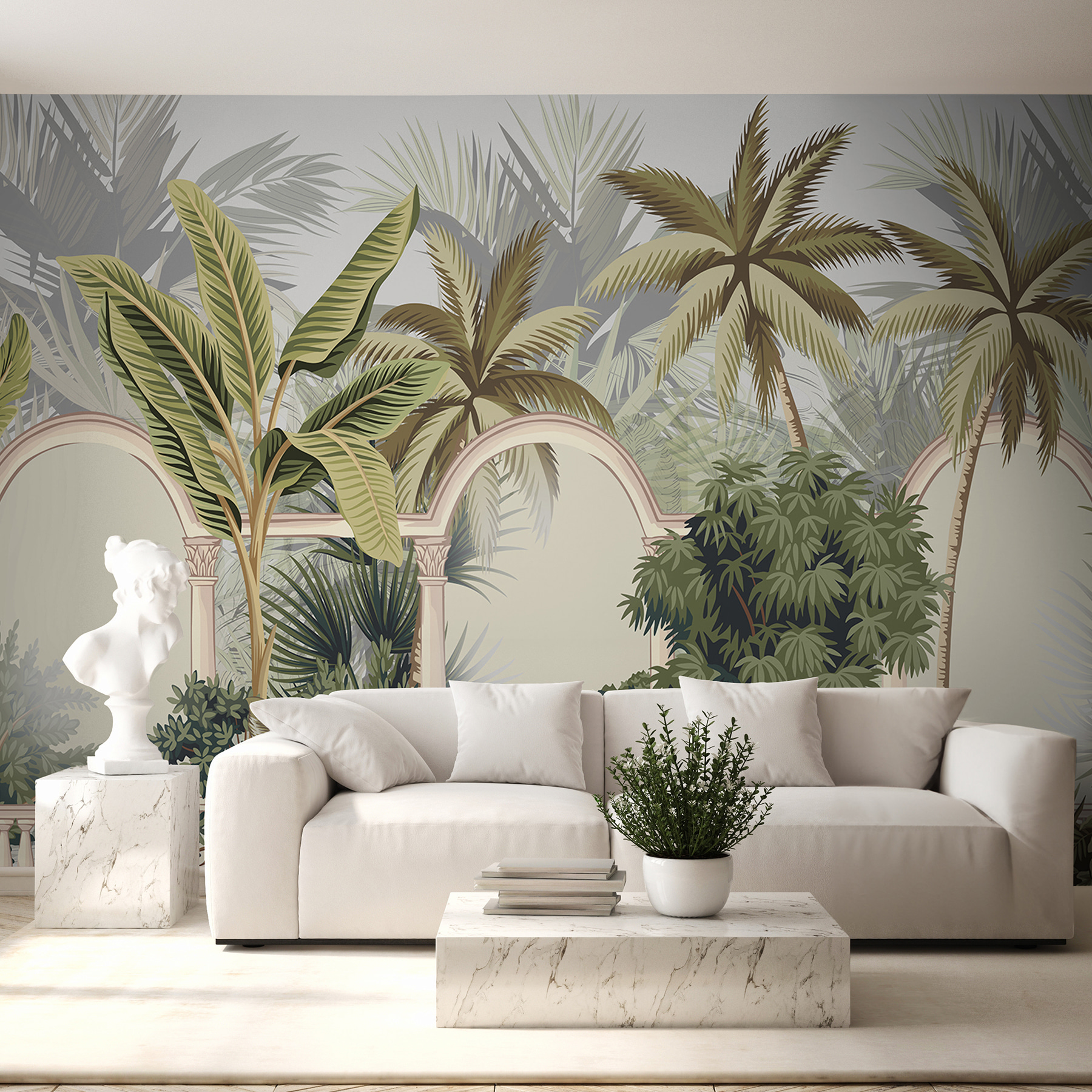 Stellen Sie sich vor, Sie betreten Ihr Zimmer und haben das Gefühl, in eine heitere tropische Oase eingetreten zu sein. Dieses Wandbild mit seinen anmutigen Palmen, die sich sanft vor eleganten Bögen wiegen, schafft diese Atmosphäre mühelos. Es ist wie Ihre eigene kleine Flucht – ein Fenster zu einem üppigen Dschungel, ohne das Haus zu verlassen. Perfekt, um einen Hauch von Natur und einen Hauch von Abenteuer in Ihren Raum zu bringen. Wer hätte gedacht, dass eine Wand Ihr Ticket ins Paradies sein kann? Fügen Sie ein paar bequeme Sitzgelegenheiten hinzu, und schon können Sie sich in Tagträumen von der Inselbrise verlieren.
