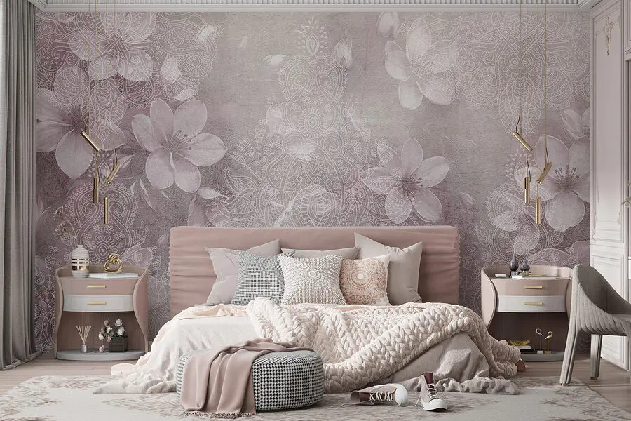 Verwandeln Sie Ihren Raum mit “Zarte Blumen mit komplizierten Mustern”. Dieses Wandbild ist nicht nur ein Wandbelag, sondern eine gemütliche, künstlerische Umarmung für Ihr Zuhause. Stellen Sie sich vor, Sie treten in einen ruhigen japanischen Garten, in dem jede Pfingstrose Geheimnisse der Ruhe verkündet. Die sanften Pastelltöne und die detaillierten Muster schaffen eine verträumte Kulisse, die zum Träumen einlädt. Es eignet sich perfekt für eine Leseecke oder vielleicht über dem Sofa, wo Gäste es bewundern können, während sie über die Geheimnisse des Lebens nachdenken – zum Beispiel darüber, wie viele Pfingstrosen zu viel sind. Diese Fototapete bringt Ruhe in jeden Raum und ist gleichzeitig erfrischend einzigartig. Lassen Sie diese verschlungenen Muster über Ihre Wände tanzen und zaubern Sie sich jedes Mal ein Lächeln ins Gesicht, wenn Sie vorbeigehen!